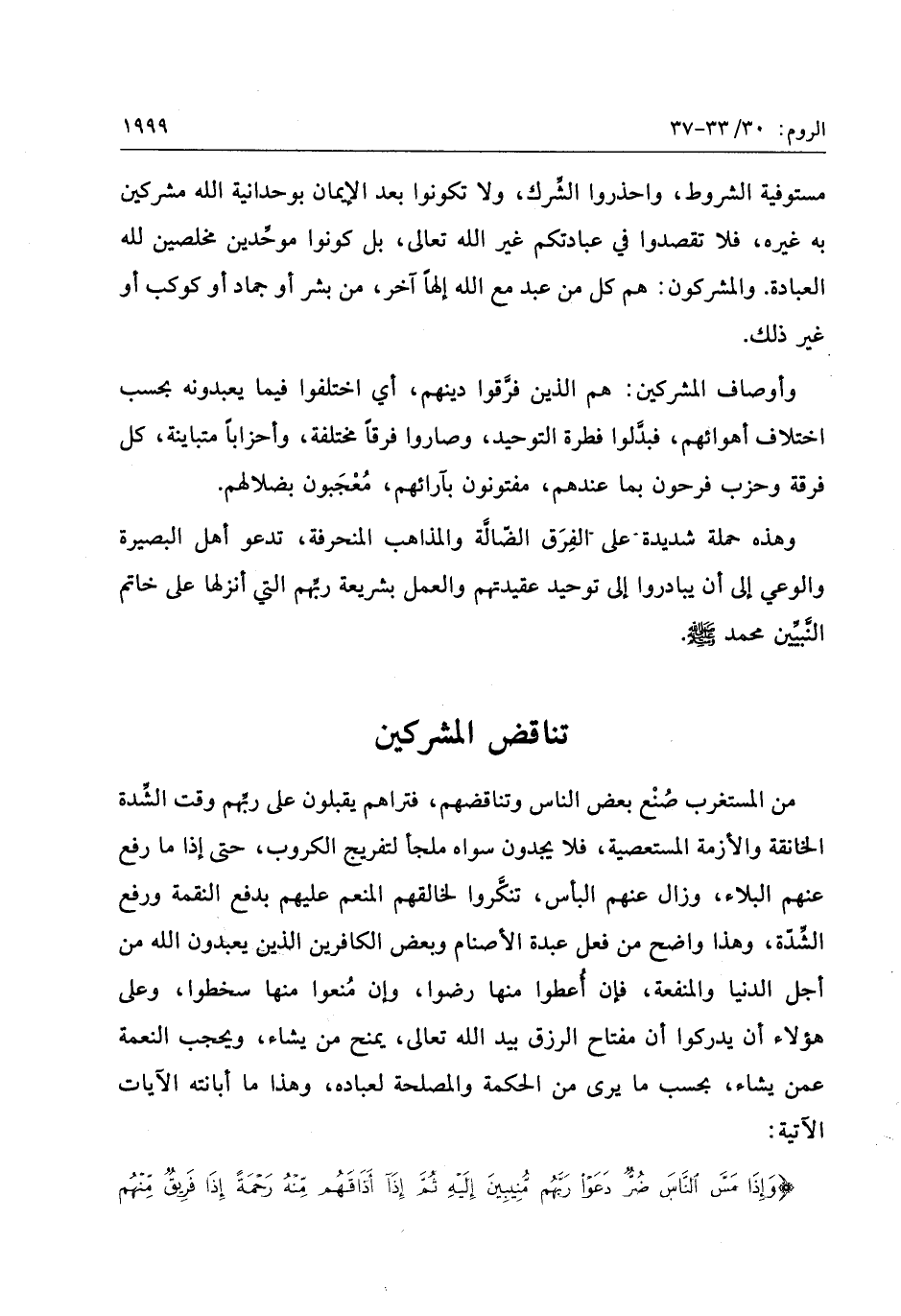 وَإِذا مَسَّ النَّاسَ ضُرٌّ دَعَوْا رَبَّهُمْ مُنِيبِينَ إِلَيْهِ ثُمَّ إِذا أَذاقَهُمْ مِنْهُ رَحْمَةً إِذا فَرِيقٌ مِنْهُمْ بِرَبِّهِمْ يُشْرِكُونَ (33) لِيَكْفُرُوا بِما آتَيْناهُمْ فَتَمَتَّعُوا فَسَوْفَ تَعْلَمُونَ (34) أَمْ أَنْزَلْنا عَلَيْهِمْ سُلْطاناً فَهُوَ يَتَكَلَّمُ بِما كانُوا بِهِ يُشْرِكُونَ (35) وَإِذا أَذَقْنَا النَّاسَ رَحْمَةً فَرِحُوا بِها وَإِنْ تُصِبْهُمْ سَيِّئَةٌ بِما قَدَّمَتْ أَيْدِيهِمْ إِذا هُمْ يَقْنَطُونَ (36) أَوَلَمْ يَرَوْا أَنَّ اللَّهَ يَبْسُطُ الرِّزْقَ لِمَنْ يَشاءُ وَيَقْدِرُ إِنَّ فِي ذلِكَ لَآياتٍ لِقَوْمٍ يُؤْمِنُونَ (37)