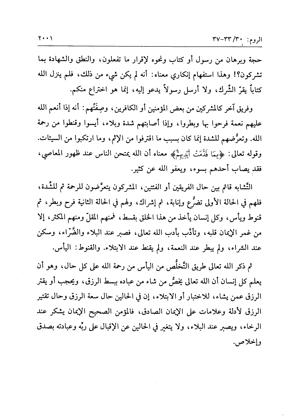 التّشابه قائم بين حال الفريقين أو الفئتين، المشركون يتعرّضون للرحمة ثم للشّدة، فلهم في الحالة الأولى تضرّع وإنابة، ثم إشراك، ولهم في الحالة الثانية فرح وبطر، ثم قنوط ويأس، وكل إنسان يأخذ من هذا الخلق بقسط، فمنهم المقلّ ومنهم المكثر، إلا من غمر الإيمان قلبه، وتأدّب بأدب الله تعالى، فصبر عند البلاء والضّرّاء، وسكن عند السّراء، ولم يبطر عند النعمة، ولم يقنط عند الابتلاء. والقنوط: اليأس.