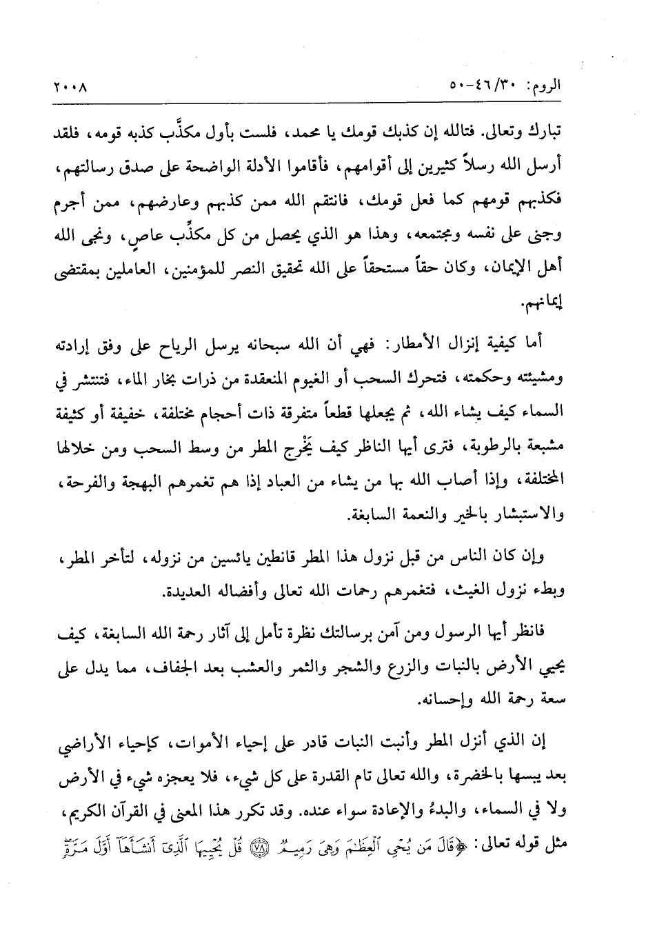 إن الذي أنزل المطر وأنبت النبات قادر على إحياء الأموات، كإحياء الأراضي بعد يبسها بالخضرة، والله تعالى تام القدرة على كل شيء، فلا يعجزه شيء في الأرض ولا في السماء، والبدء والإعادة سواء عنده. وقد تكرر هذا المعنى في القرآن الكريم، مثل قوله تعالى: قالَ مَنْ يُحْيِ الْعِظامَ وَهِيَ رَمِيمٌ (78) قُلْ يُحْيِيهَا الَّذِي أَنْشَأَها أَوَّلَ مَرَّةٍ