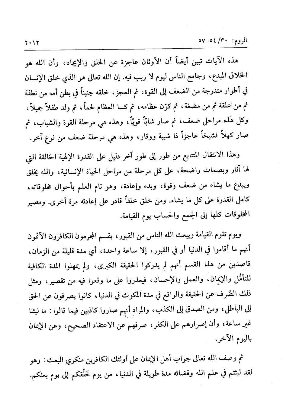 هذه الآيات تبين أيضا أن الأوثان عاجزة عن الخلق والإيجاد، وأن الله هو الخلاق المبدع، وجامع الناس ليوم لا ريب فيه. إن الله تعالى هو الذي خلق الإنسان في أطوار متدرجة من الضعف إلى القوة، ثم العجز، خلقه جنينا في بطن أمه من نطفة ثم من علقة ثم من مضغة، ثم كوّن عظامه، ثم كسا العظام لحما، ثم ولد طفلا جميلا، وكل هذه مراحل ضعف، ثم صار شابّا قويّا، وهذه هي مرحلة القوة والشباب، ثم صار كهلا فشيخا عاجزا ذا شيبة ووقار، وهذه هي مرحلة ضعف من نوع آخر.