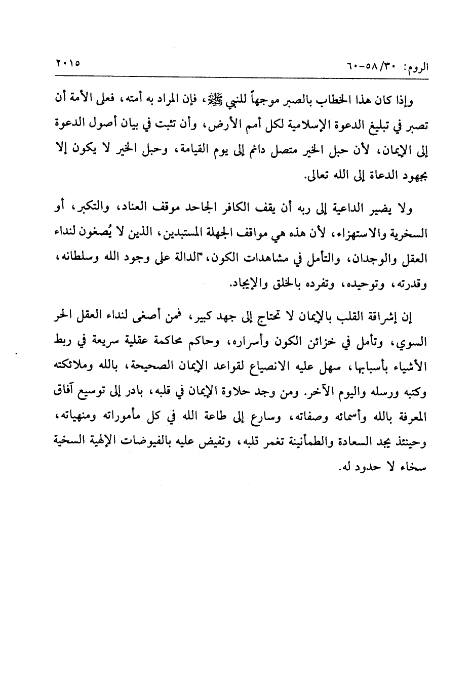 إن إشراقة القلب بالإيمان لا تحتاج إلى جهد كبير، فمن أصغى لنداء العقل الحر السوي، وتأمل في خزائن الكون وأسراره، وحاكم محاكمة عقلية سريعة في ربط الأشياء بأسبابها، سهل عليه الانصياع لقواعد الإيمان الصحيحة، بالله وملائكته وكتبه ورسله واليوم الآخر. ومن وجد حلاوة الإيمان في قلبه، بادر إلى توسيع آفاق المعرفة بالله وأسمائه وصفاته، وسارع إلى طاعة الله في كل مأموراته ومنهياته، وحينئذ يجد السعادة والطمأنينة تغمر قلبه، وتفيض عليه بالفيوضات الإلهية السخية سخاء لا حدود له.