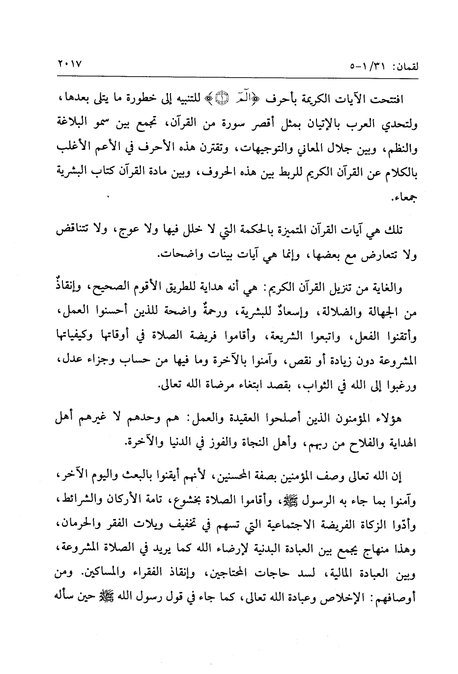 والغاية من تنزيل القرآن الكريم: هي أنه هداية للطريق الأقوم الصحيح، وإنقاذ من الجهالة والضلالة، وإسعاد للبشرية، ورحمة واضحة للذين أحسنوا العمل، وأتقنوا الفعل، واتبعوا الشريعة، وأقاموا فريضة الصلاة في أوقاتها وكيفياتها المشروعة دون زيادة أو نقص، وآمنوا بالآخرة وما فيها من حساب وجزاء عدل، ورغبوا إلى الله في الثواب، بقصد ابتغاء مرضاة الله تعالى.