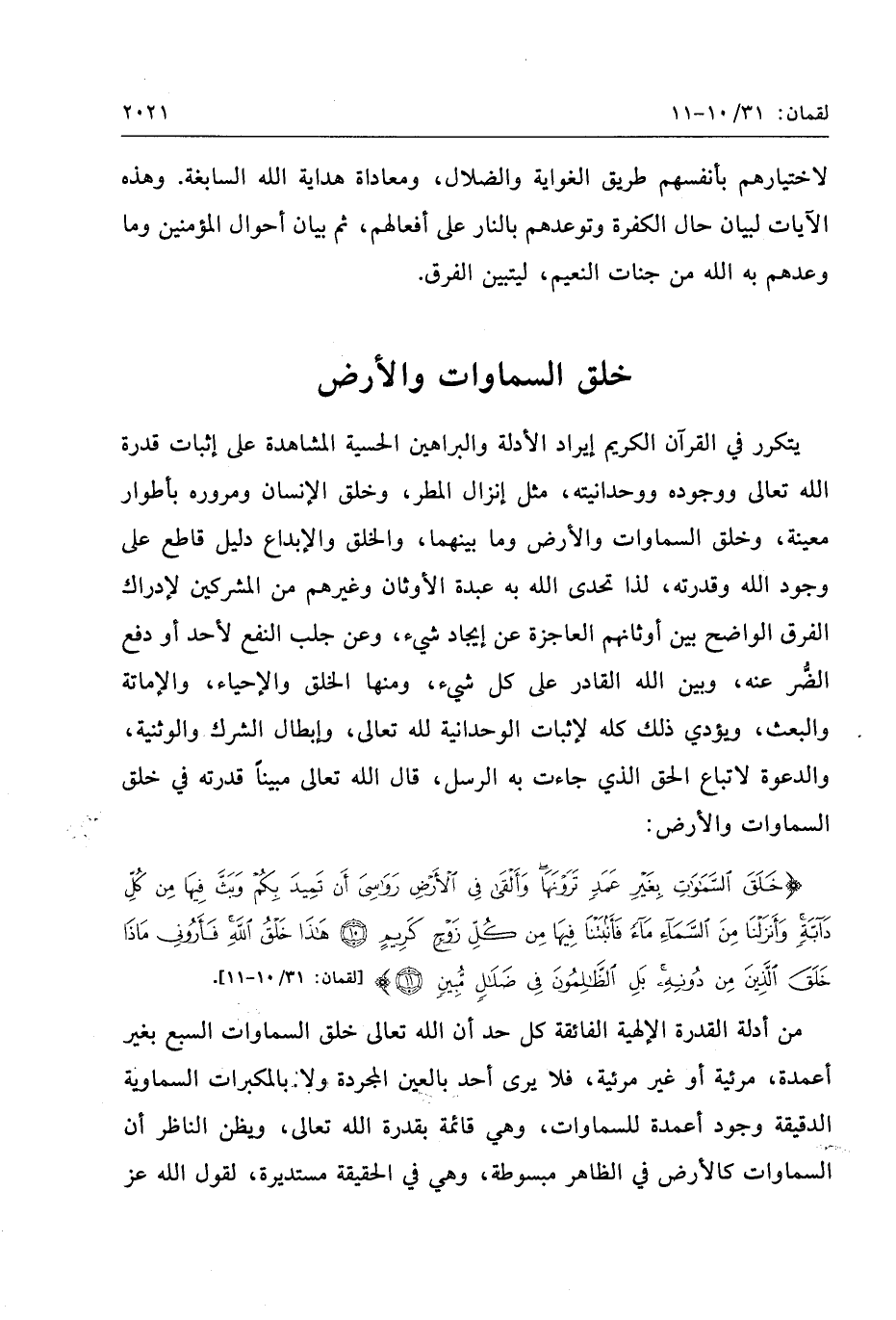 خَلَقَ السَّماواتِ بِغَيْرِ عَمَدٍ تَرَوْنَها وَأَلْقى فِي الْأَرْضِ رَواسِيَ أَنْ تَمِيدَ بِكُمْ وَبَثَّ فِيها مِنْ كُلِّ دابَّةٍ وَأَنْزَلْنا مِنَ السَّماءِ ماءً فَأَنْبَتْنا فِيها مِنْ كُلِّ زَوْجٍ كَرِيمٍ (10) هذا خَلْقُ اللَّهِ فَأَرُونِي ماذا خَلَقَ الَّذِينَ مِنْ دُونِهِ بَلِ الظَّالِمُونَ فِي ضَلالٍ مُبِينٍ (11)