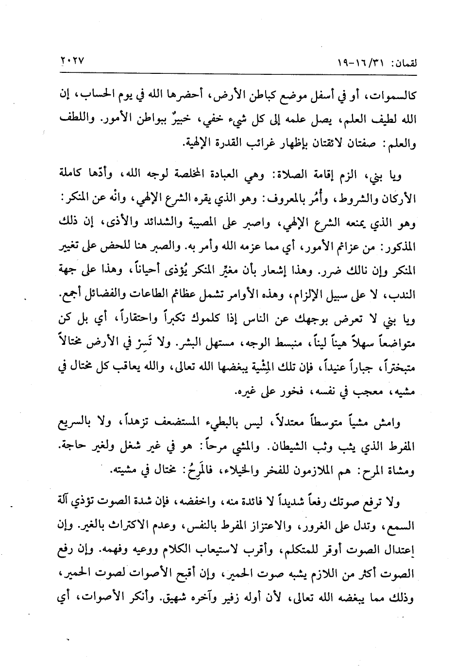 ويا بني لا تعرض بوجهك عن الناس إذا كلموك تكبرا واحتقارا، أي بل كن متواضعا سهلا هينا لينا، منبسط الوجه، مستهل البشر. ولا تسر في الأرض مختالا متبخترا، جبارا عنيدا، فإن تلك المشية يبغضها الله تعالى، والله يعاقب كل مختال في مشيه، معجب في نفسه، فخور على غيره.