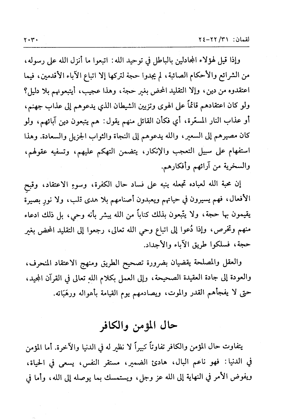 إن محبة الله لعباده تجعله ينبه على فساد حال الكفرة، وسوء الاعتقاد، وقبح الأفعال، فهم يسيرون في حياتهم ويعبدون أصنامهم بلا هدى قلب، ولا نور بصيرة يقيمون بها حجة، ولا يتّبعون بذلك كتابا من الله يبشر بأنه وحي، بل ذلك ادعاء منهم وتخرص، وإذا دعوا إلى اتباع وحي الله تعالى، رجعوا إلى التقليد المحض بغير حجة، فسلكوا طريق الآباء والأجداد.