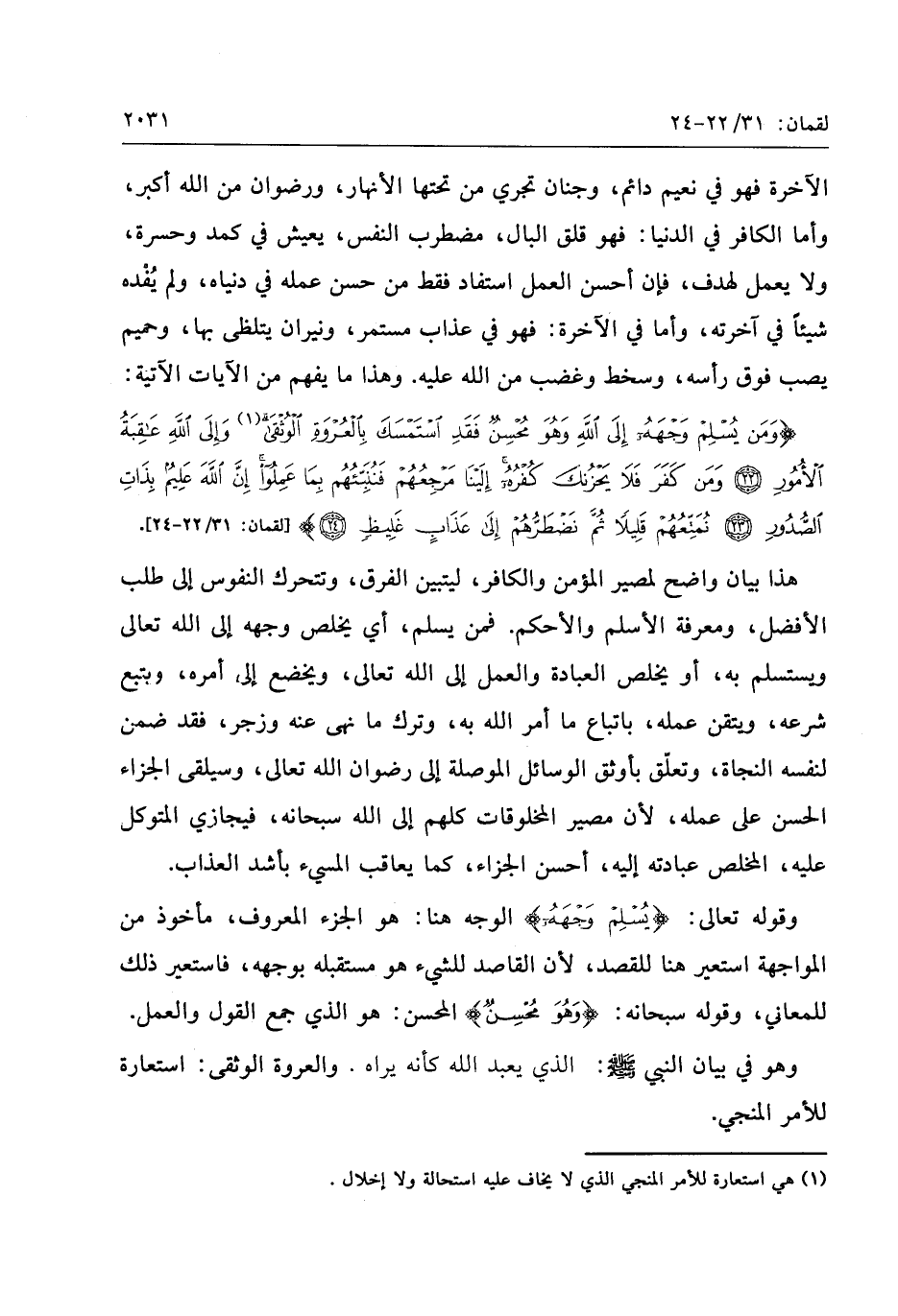 وَمَنْ يُسْلِمْ وَجْهَهُ إِلَى اللَّهِ وَهُوَ مُحْسِنٌ فَقَدِ اسْتَمْسَكَ بِالْعُرْوَةِ الْوُثْقى وَإِلَى اللَّهِ عاقِبَةُ الْأُمُورِ (22) وَمَنْ كَفَرَ فَلا يَحْزُنْكَ كُفْرُهُ إِلَيْنا مَرْجِعُهُمْ فَنُنَبِّئُهُمْ بِما عَمِلُوا إِنَّ اللَّهَ عَلِيمٌ بِذاتِ الصُّدُورِ (23) نُمَتِّعُهُمْ قَلِيلاً ثُمَّ نَضْطَرُّهُمْ إِلى عَذابٍ غَلِيظٍ (24)