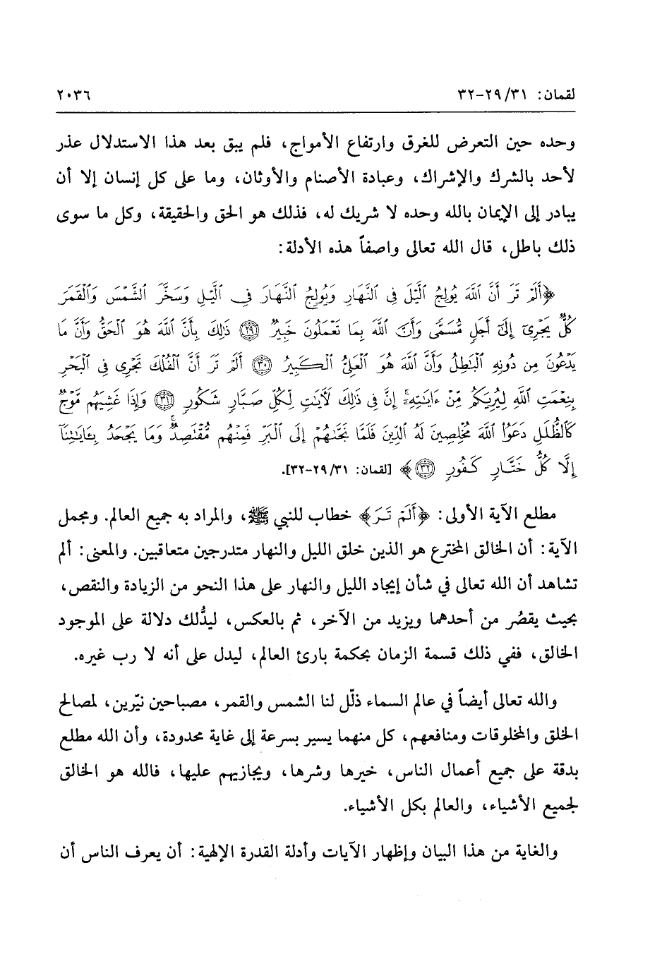 أَلَمْ تَرَ أَنَّ اللَّهَ يُولِجُ اللَّيْلَ فِي النَّهارِ وَيُولِجُ النَّهارَ فِي اللَّيْلِ وَسَخَّرَ الشَّمْسَ وَالْقَمَرَ كُلٌّ يَجْرِي إِلى أَجَلٍ مُسَمًّى وَأَنَّ اللَّهَ بِما تَعْمَلُونَ خَبِيرٌ (29) ذلِكَ بِأَنَّ اللَّهَ هُوَ الْحَقُّ وَأَنَّ ما يَدْعُونَ مِنْ دُونِهِ الْباطِلُ وَأَنَّ اللَّهَ هُوَ الْعَلِيُّ الْكَبِيرُ (30) أَلَمْ تَرَ أَنَّ الْفُلْكَ تَجْرِي فِي الْبَحْرِ بِنِعْمَتِ اللَّهِ لِيُرِيَكُمْ مِنْ آياتِهِ إِنَّ فِي ذلِكَ لَآياتٍ لِكُلِّ صَبَّارٍ شَكُورٍ (31) وَإِذا غَشِيَهُمْ مَوْجٌ كَالظُّلَلِ دَعَوُا اللَّهَ مُخْلِصِينَ لَهُ الدِّينَ فَلَمَّا نَجَّاهُمْ إِلَى الْبَرِّ فَمِنْهُمْ مُقْتَصِدٌ وَما يَجْحَدُ بِآياتِنا إِلاَّ كُلُّ خَتَّارٍ كَفُورٍ (32)