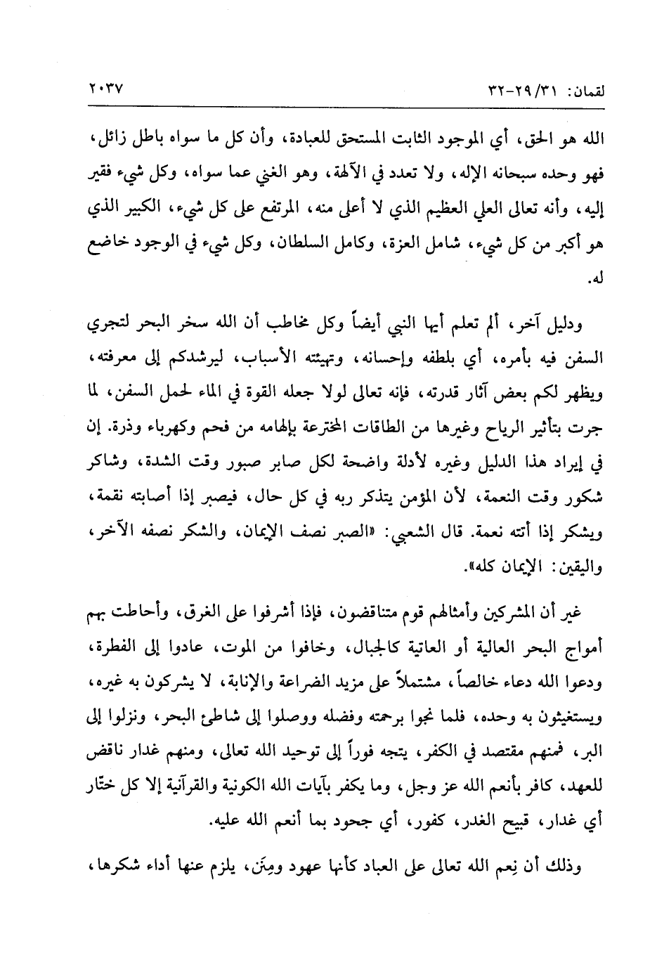 ودليل آخر، ألم تعلم أيها النبي أيضا وكل مخاطب أن الله سخر البحر لتجري السفن فيه بأمره، أي بلطفه وإحسانه، وتهيئته الأسباب، ليرشدكم إلى معرفته، ويظهر لكم بعض آثار قدرته، فإنه تعالى لولا جعله القوة في الماء لحمل السفن، لما جرت بتأثير الرياح وغيرها من الطاقات المخترعة بإلهامه من فحم وكهرباء وذرة. إن في إيراد هذا الدليل وغيره لأدلة واضحة لكل صابر صبور وقت الشدة، وشاكر شكور وقت النعمة، لأن المؤمن يتذكر ربه في كل حال، فيصبر إذا أصابته نقمة، ويشكر إذا أتته نعمة. قال الشعبي: «الصبر نصف الإيمان، والشكر نصفه الآخر، واليقين: الإيمان كله» .
