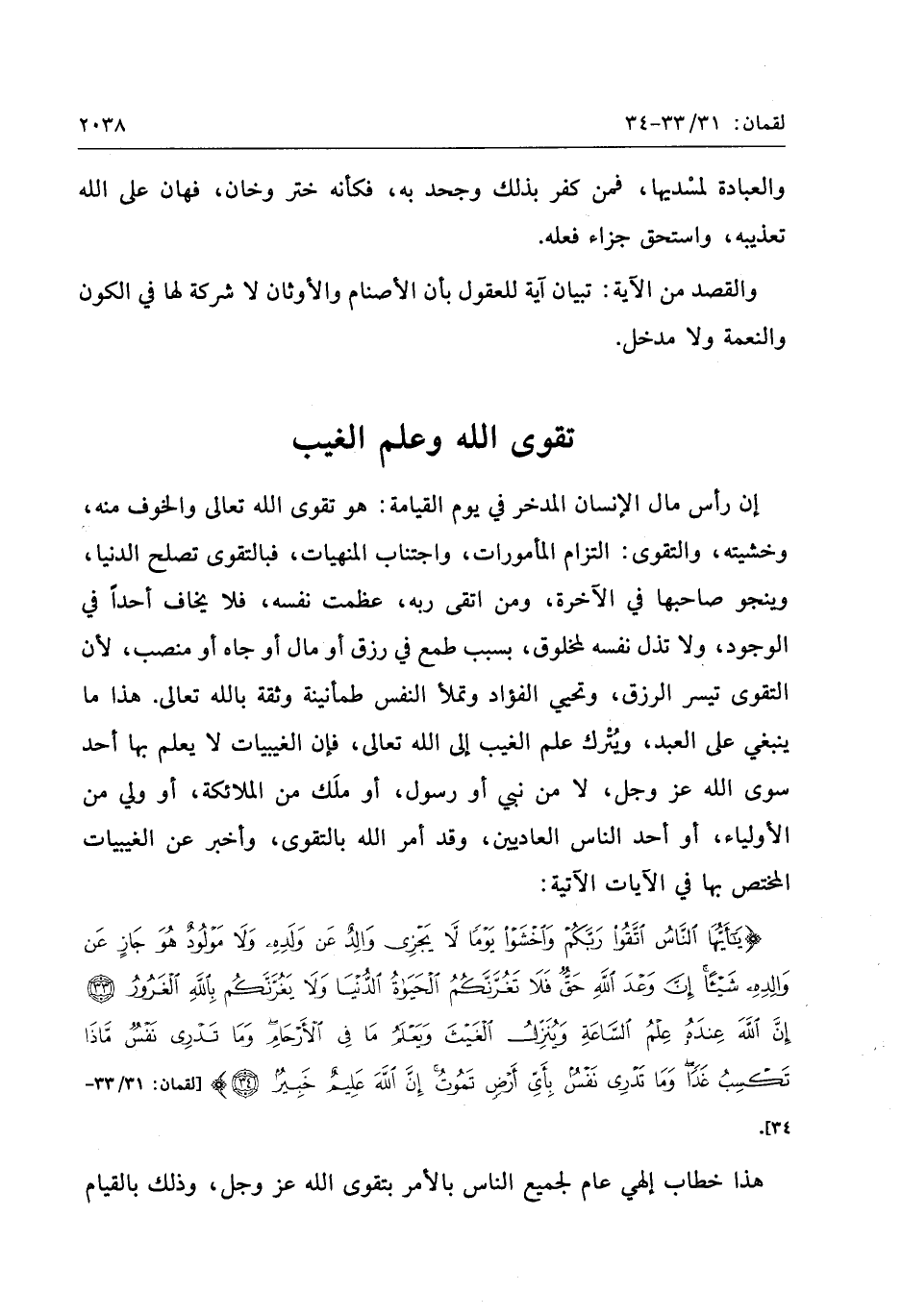 يا أَيُّهَا النَّاسُ اتَّقُوا رَبَّكُمْ وَاخْشَوْا يَوْماً لا يَجْزِي والِدٌ عَنْ وَلَدِهِ وَلا مَوْلُودٌ هُوَ جازٍ عَنْ والِدِهِ شَيْئاً إِنَّ وَعْدَ اللَّهِ حَقٌّ فَلا تَغُرَّنَّكُمُ الْحَياةُ الدُّنْيا وَلا يَغُرَّنَّكُمْ بِاللَّهِ الْغَرُورُ (33) إِنَّ اللَّهَ عِنْدَهُ عِلْمُ السَّاعَةِ وَيُنَزِّلُ الْغَيْثَ وَيَعْلَمُ ما فِي الْأَرْحامِ وَما تَدْرِي نَفْسٌ ماذا تَكْسِبُ غَداً وَما تَدْرِي نَفْسٌ بِأَيِّ أَرْضٍ تَمُوتُ إِنَّ اللَّهَ عَلِيمٌ خَبِيرٌ (34)