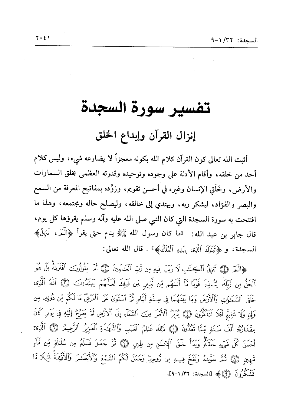 أثبت الله تعالى كون القرآن كلام الله بكونه معجزا لا يضارعه شيء، وليس كلام أحد من خلقه، وأقام الأدلة على وجوده وتوحيده وقدرته العظمى بخلق السماوات والأرض، وخلق الإنسان وغيره في أحسن تقويم، وزوّده بمفاتيح المعرفة من السمع والبصر والفؤاد، ليشكر ربه، ويهتدي إلى خالقه، وليصلح حاله ومجتمعة، وهذا ما افتتحت به سورة السجدة التي كان النبي صلى الله عليه وآله وسلّم يقرؤها كل يوم،