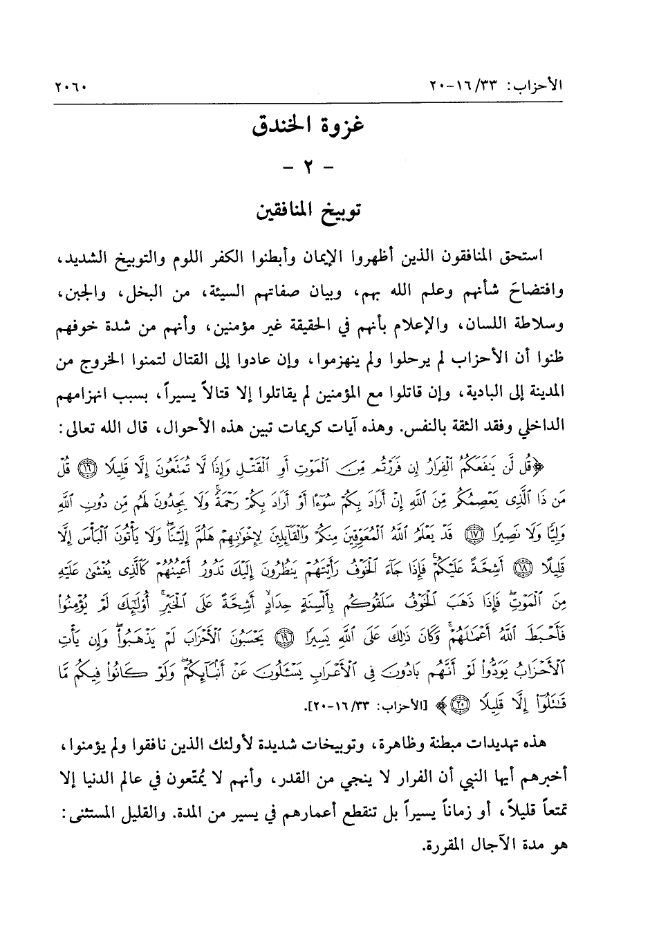 قُلْ لَنْ يَنْفَعَكُمُ الْفِرارُ إِنْ فَرَرْتُمْ مِنَ الْمَوْتِ أَوِ الْقَتْلِ وَإِذاً لا تُمَتَّعُونَ إِلاَّ قَلِيلاً (16) قُلْ مَنْ ذَا الَّذِي يَعْصِمُكُمْ مِنَ اللَّهِ إِنْ أَرادَ بِكُمْ سُوءاً أَوْ أَرادَ بِكُمْ رَحْمَةً وَلا يَجِدُونَ لَهُمْ مِنْ دُونِ اللَّهِ وَلِيًّا وَلا نَصِيراً (17) قَدْ يَعْلَمُ اللَّهُ الْمُعَوِّقِينَ مِنْكُمْ وَالْقائِلِينَ لِإِخْوانِهِمْ هَلُمَّ إِلَيْنا وَلا يَأْتُونَ الْبَأْسَ إِلاَّ قَلِيلاً (18) أَشِحَّةً عَلَيْكُمْ فَإِذا جاءَ الْخَوْفُ رَأَيْتَهُمْ يَنْظُرُونَ إِلَيْكَ تَدُورُ أَعْيُنُهُمْ كَالَّذِي يُغْشى عَلَيْهِ مِنَ الْمَوْتِ فَإِذا ذَهَبَ الْخَوْفُ سَلَقُوكُمْ بِأَلْسِنَةٍ حِدادٍ أَشِحَّةً عَلَى الْخَيْرِ أُولئِكَ لَمْ يُؤْمِنُوا فَأَحْبَطَ اللَّهُ أَعْمالَهُمْ وَكانَ ذلِكَ عَلَى اللَّهِ يَسِيراً (19) يَحْسَبُونَ الْأَحْزابَ لَمْ يَذْهَبُوا وَإِنْ يَأْتِ الْأَحْزابُ يَوَدُّوا لَوْ أَنَّهُمْ بادُونَ فِي الْأَعْرابِ يَسْئَلُونَ عَنْ أَنْبائِكُمْ وَلَوْ كانُوا فِيكُمْ ما قاتَلُوا إِلاَّ قَلِيلاً (20)