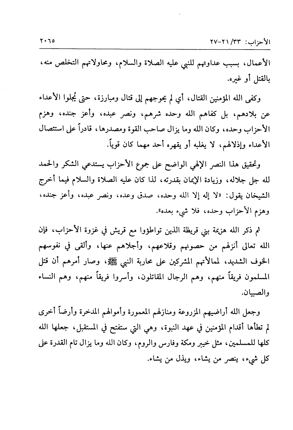 وكفى الله المؤمنين القتال، أي لم يحوجهم إلى قتال ومبارزة، حتى يجلوا الأعداء عن بلادهم، بل كفاهم الله وحده شرهم، ونصر عبده، وأعز جنده، وهزم الأحزاب وحده، وكان الله وما يزال صاحب القوة ومصدرها، قادرا على استئصال الأعداء وإذلالهم، لا يغلبه أو يقهره أحد مهما كان قويا.