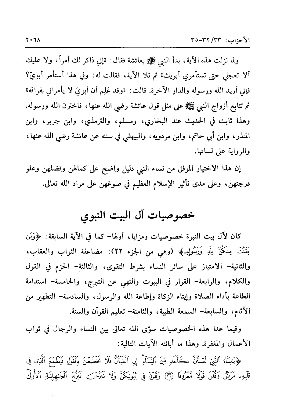 يا نِساءَ النَّبِيِّ لَسْتُنَّ كَأَحَدٍ مِنَ النِّساءِ إِنِ اتَّقَيْتُنَّ فَلا تَخْضَعْنَ بِالْقَوْلِ فَيَطْمَعَ الَّذِي فِي قَلْبِهِ مَرَضٌ وَقُلْنَ قَوْلاً مَعْرُوفاً (32) وَقَرْنَ فِي بُيُوتِكُنَّ وَلا تَبَرَّجْنَ تَبَرُّجَ الْجاهِلِيَّةِ الْأُولى وَأَقِمْنَ الصَّلاةَ وَآتِينَ الزَّكاةَ وَأَطِعْنَ اللَّهَ وَرَسُولَهُ إِنَّما يُرِيدُ اللَّهُ لِيُذْهِبَ عَنْكُمُ الرِّجْسَ أَهْلَ الْبَيْتِ وَيُطَهِّرَكُمْ تَطْهِيراً (33) وَاذْكُرْنَ ما يُتْلى فِي بُيُوتِكُنَّ مِنْ آياتِ اللَّهِ وَالْحِكْمَةِ إِنَّ اللَّهَ كانَ لَطِيفاً خَبِيراً (34) إِنَّ الْمُسْلِمِينَ وَالْمُسْلِماتِ وَالْمُؤْمِنِينَ وَالْمُؤْمِناتِ وَالْقانِتِينَ وَالْقانِتاتِ وَالصَّادِقِينَ وَالصَّادِقاتِ وَالصَّابِرِينَ وَالصَّابِراتِ وَالْخاشِعِينَ وَالْخاشِعاتِ وَالْمُتَصَدِّقِينَ وَالْمُتَصَدِّقاتِ وَالصَّائِمِينَ وَالصَّائِماتِ وَالْحافِظِينَ فُرُوجَهُمْ وَالْحافِظاتِ وَالذَّاكِرِينَ اللَّهَ كَثِيراً وَالذَّاكِراتِ أَعَدَّ اللَّهُ لَهُمْ مَغْفِرَةً وَأَجْراً عَظِيماً (35)