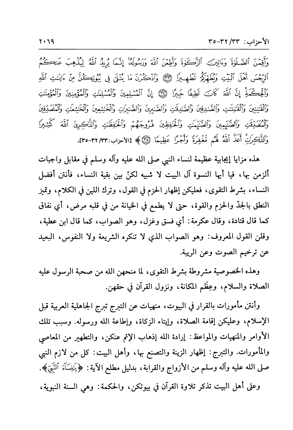 وأنتن مأمورات بالقرار في البيوت، منهيات عن التبرج تبرج الجاهلية العربية قبل الإسلام، وعليكن إقامة الصلاة، وإيتاء الزكاة، وإطاعة الله ورسوله. وسبب تلك الأوامر والمنهيات والمواعظ: إرادة الله إذهاب الإثم عنكن، والتطهير من المعاصي والمأمورات. والتبرج: إظهار الزينة والتصنع بها، وأهل البيت: كل من لازم النبي صلى الله عليه وآله وسلّم من الأزواج والقرابة، بدليل مطلع الآية: يا نِساءَ النَّبِيِّ.