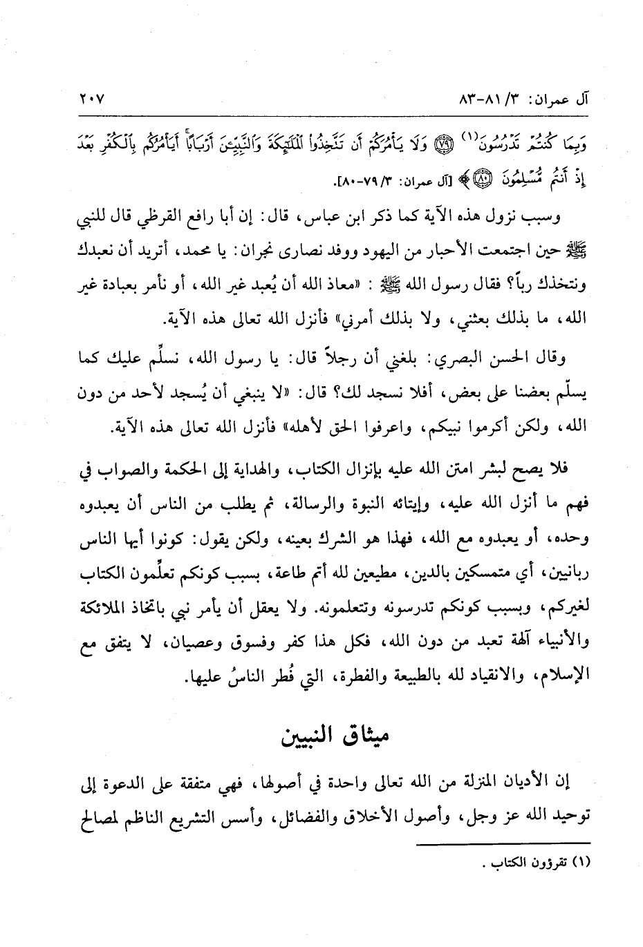 فلا يصح لبشر امتن الله عليه بإنزال الكتاب، والهداية إلى الحكمة والصواب في فهم ما أنزل الله عليه، وإيتائه النبوة والرسالة، ثم يطلب من الناس أن يعبدوه وحده، أو يعبدوه مع الله، فهذا هو الشرك بعينه، ولكن يقول: كونوا أيها الناس ربانيين، أي متمسكين بالدين، مطيعين لله أتم طاعة، بسبب كونكم تعلّمون الكتاب لغيركم، وبسبب كونكم تدرسونه وتتعلمونه. ولا يعقل أن يأمر نبي باتخاذ الملائكة والأنبياء آلهة تعبد من دون الله، فكل هذا كفر وفسوق وعصيان، لا يتفق مع الإسلام، والانقياد لله بالطبيعة والفطرة، التي فطر الناس عليها.