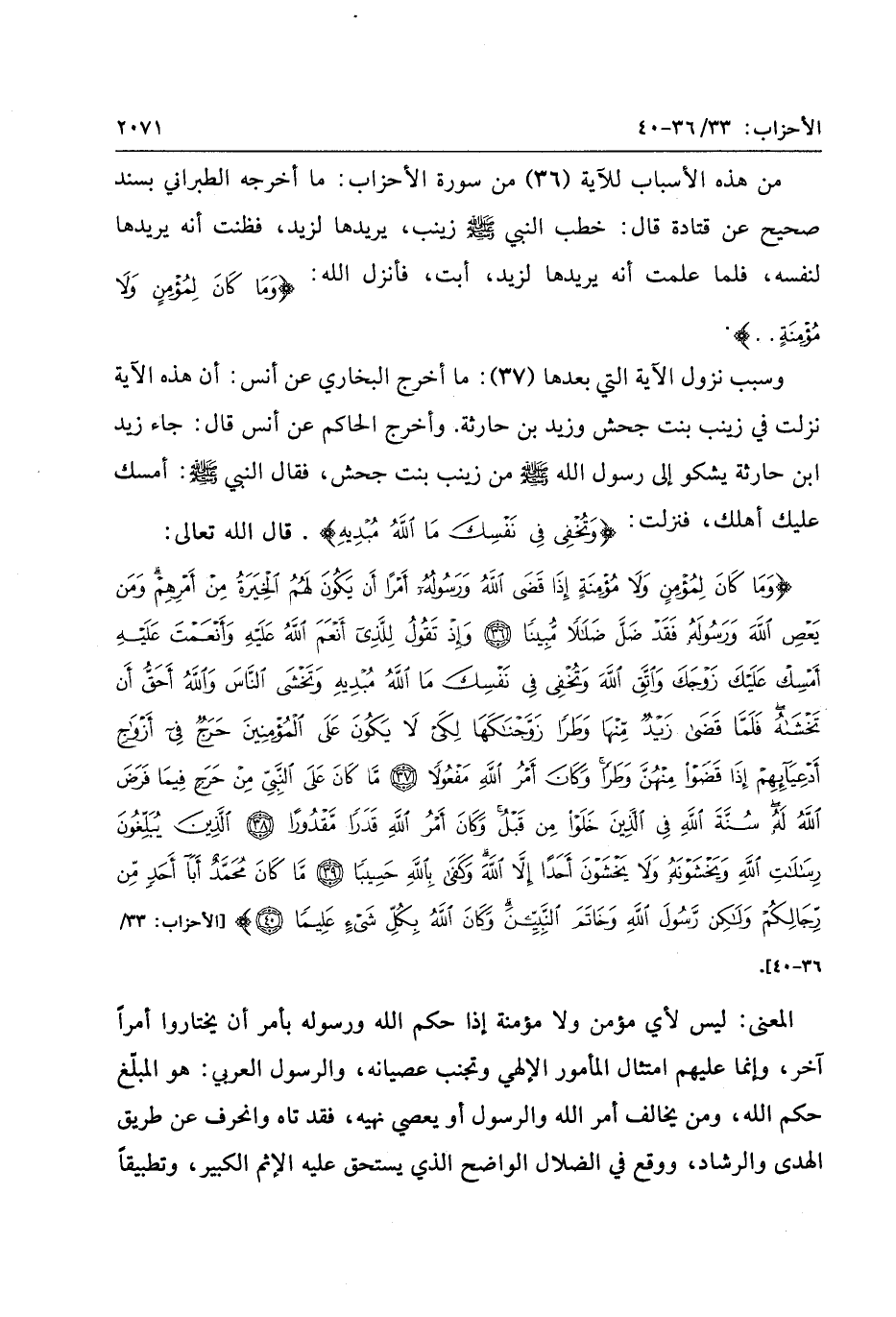 وَما كانَ لِمُؤْمِنٍ وَلا مُؤْمِنَةٍ إِذا قَضَى اللَّهُ وَرَسُولُهُ أَمْراً أَنْ يَكُونَ لَهُمُ الْخِيَرَةُ مِنْ أَمْرِهِمْ وَمَنْ يَعْصِ اللَّهَ وَرَسُولَهُ فَقَدْ ضَلَّ ضَلالاً مُبِيناً (36) وَإِذْ تَقُولُ لِلَّذِي أَنْعَمَ اللَّهُ عَلَيْهِ وَأَنْعَمْتَ عَلَيْهِ أَمْسِكْ عَلَيْكَ زَوْجَكَ وَاتَّقِ اللَّهَ وَتُخْفِي فِي نَفْسِكَ مَا اللَّهُ مُبْدِيهِ وَتَخْشَى النَّاسَ وَاللَّهُ أَحَقُّ أَنْ تَخْشاهُ فَلَمَّا قَضى زَيْدٌ مِنْها وَطَراً زَوَّجْناكَها لِكَيْ لا يَكُونَ عَلَى الْمُؤْمِنِينَ حَرَجٌ فِي أَزْواجِ أَدْعِيائِهِمْ إِذا قَضَوْا مِنْهُنَّ وَطَراً وَكانَ أَمْرُ اللَّهِ مَفْعُولاً (37) ما كانَ عَلَى النَّبِيِّ مِنْ حَرَجٍ فِيما فَرَضَ اللَّهُ لَهُ سُنَّةَ اللَّهِ فِي الَّذِينَ خَلَوْا مِنْ قَبْلُ وَكانَ أَمْرُ اللَّهِ قَدَراً مَقْدُوراً (38) الَّذِينَ يُبَلِّغُونَ رِسالاتِ اللَّهِ وَيَخْشَوْنَهُ وَلا يَخْشَوْنَ أَحَداً إِلاَّ اللَّهَ وَكَفى بِاللَّهِ حَسِيباً (39) ما كانَ مُحَمَّدٌ أَبا أَحَدٍ مِنْ رِجالِكُمْ وَلكِنْ رَسُولَ اللَّهِ وَخاتَمَ النَّبِيِّينَ وَكانَ اللَّهُ بِكُلِّ شَيْءٍ عَلِيماً (40)