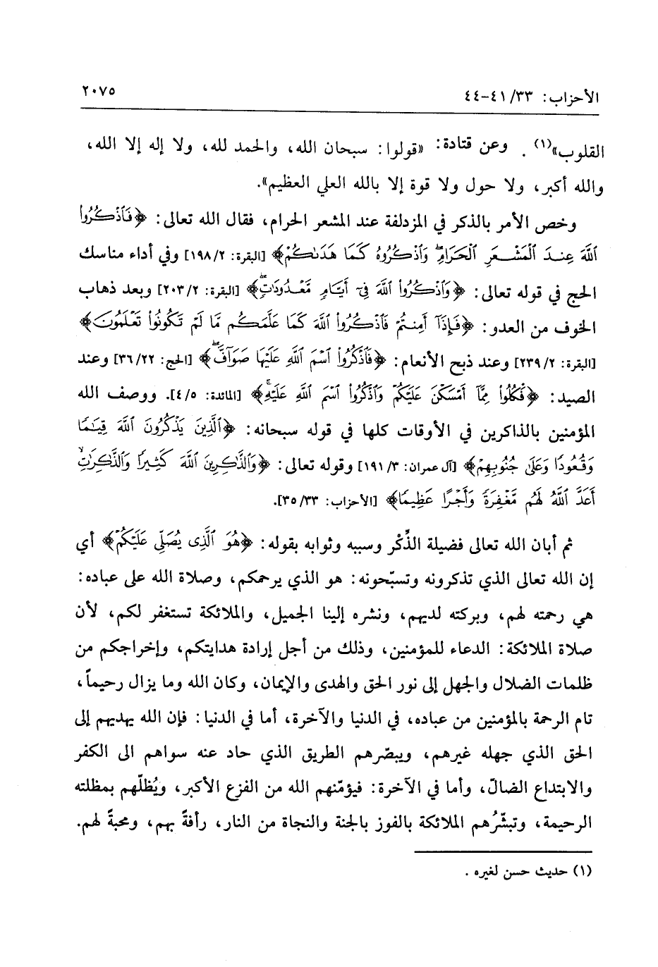 القلوب» «1» . وعن قتادة: «قولوا: سبحان الله، والحمد لله، ولا إله إلا الله، والله أكبر، ولا حول ولا قوة إلا بالله العلي العظيم» .