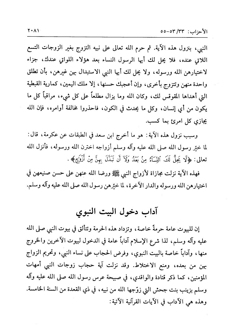 إن للبيوت عامة حرمة خاصة، وتزداد هذه الحرمة وتتألق في بيوت النبي صلى الله عليه وآله وسلّم، لذا شرع الإسلام آدابا عامة في الدخول لبيوت الآخرين والخروج منها، وآدابا خاصة بالبيت النبوي، وفرض الحجاب على نساء النبي، وتحريم الزواج بهن من بعده، ومنع الاختلاط. وقد نزلت آية حجاب زوجات النبي أمهات المؤمنين، كما ذكر قتادة والواقدي، في صبيحة عرس رسول الله صلى الله عليه وآله وسلّم بزينب بنت جحش التي زوّجها الله من نبيه، في ذي القعدة من السنة الخامسة.