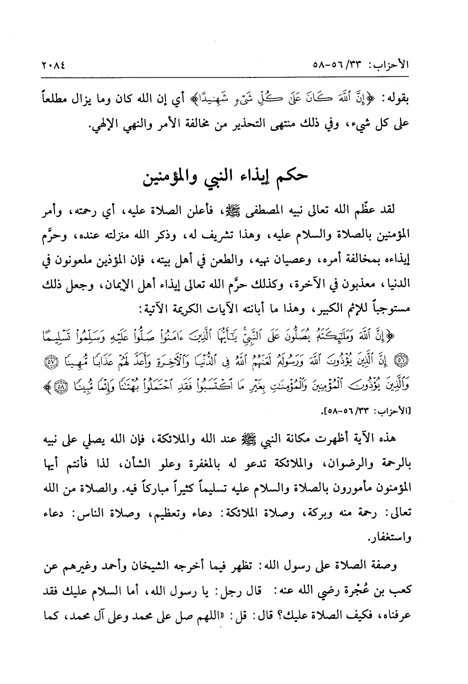 إِنَّ اللَّهَ وَمَلائِكَتَهُ يُصَلُّونَ عَلَى النَّبِيِّ يا أَيُّهَا الَّذِينَ آمَنُوا صَلُّوا عَلَيْهِ وَسَلِّمُوا تَسْلِيماً (56) إِنَّ الَّذِينَ يُؤْذُونَ اللَّهَ وَرَسُولَهُ لَعَنَهُمُ اللَّهُ فِي الدُّنْيا وَالْآخِرَةِ وَأَعَدَّ لَهُمْ عَذاباً مُهِيناً (57) وَالَّذِينَ يُؤْذُونَ الْمُؤْمِنِينَ وَالْمُؤْمِناتِ بِغَيْرِ مَا اكْتَسَبُوا فَقَدِ احْتَمَلُوا بُهْتاناً وَإِثْماً مُبِيناً (58)