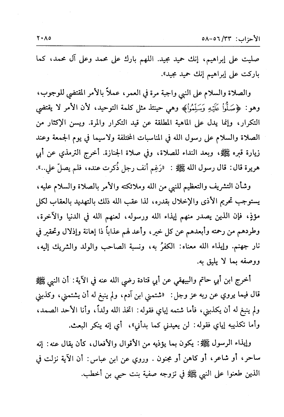 وشأن التشريف والتعظيم للنبي من الله وملائكته والأمر بالصلاة والسلام عليه، يستوجب تحريم الأذى والإخلال بقدره، لذا عقب الله ذلك بالتهديد بالعقاب لكل مؤذ، فإن الذين يصدر منهم إيذاء الله ورسوله، لعنهم الله في الدنيا والآخرة، وطردهم من رحمته وأبعدهم عن كل خير، وأعد لهم عذابا ذا إهانة وإذلال وتحقير في نار جهنم. وإيذاء الله معناه: الكفر به، ونسبة الصاحب والولد والشريك إليه، ووصفه بما لا يليق به.
