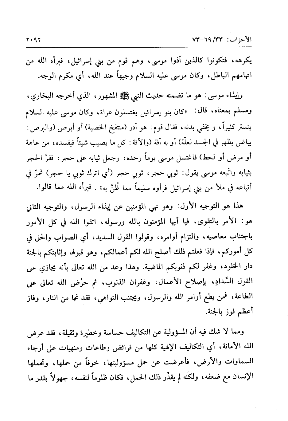 هذا هو التوجيه الأول: وهو نهي المؤمنين عن إيذاء الرسول، والتوجيه الثاني هو: الأمر بالتقوى، فيا أيها المؤمنون بالله ورسوله، اتقوا الله في كل الأمور باجتناب معاصيه، والتزام أوامره، وقولوا القول السديد، أي الصواب والحق في كل أموركم، فإذا فعلتم ذلك أصلح الله لكم أعمالكم، وهو قبولها وإثابتكم بالجنة دار الخلود، وغفر لكم ذنوبكم الماضية. وهذا وعد من الله تعالى بأنه يجازي على القول السّداد، بإصلاح الأعمال، وغفران الذنوب، ثم حرّض الله تعالى على الطاعة، فمن يطع أوامر الله والرسول، ويجتنب النواهي، فقد نجا من النار، وفاز أعظم فوز بالجنة.