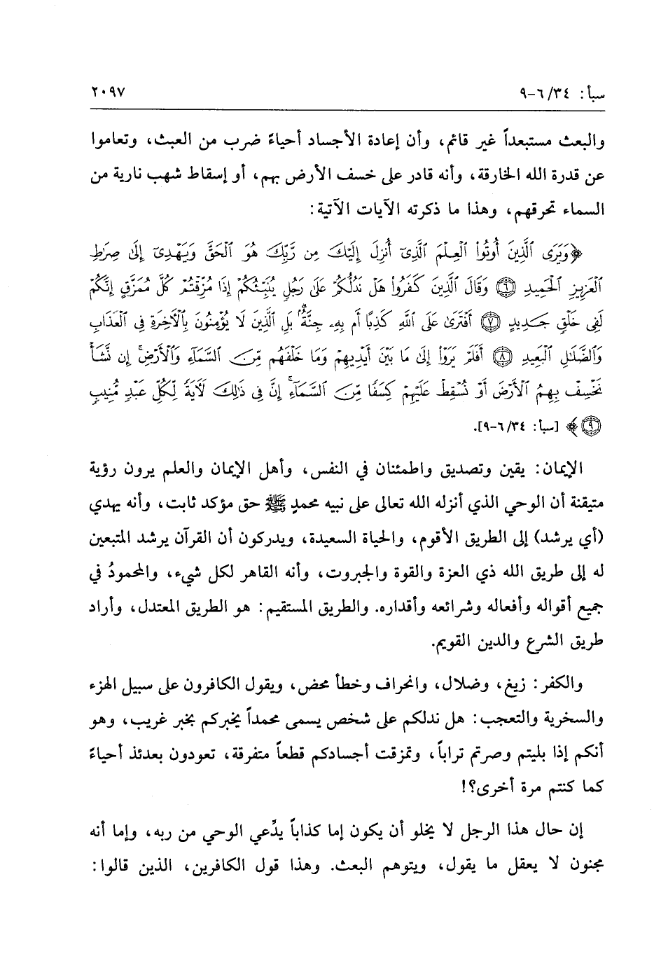 الإيمان: يقين وتصديق واطمئنان في النفس، وأهل الإيمان والعلم يرون رؤية متيقنة أن الوحي الذي أنزله الله تعالى على نبيه محمد صلّى الله عليه وسلم حق مؤكد ثابت، وأنه يهدي (أي يرشد) إلى الطريق الأقوم، والحياة السعيدة، ويدركون أن القرآن يرشد المتبعين له إلى طريق الله ذي العزة والقوة والجبروت، وأنه القاهر لكل شيء، والمحمود في جميع أقواله وأفعاله وشرائعه وأقداره. والطريق المستقيم: هو الطريق المعتدل، وأراد طريق الشرع والدين القويم.