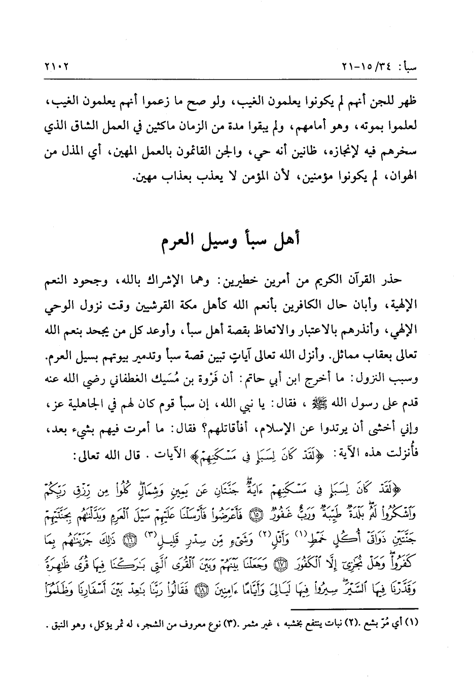 لَقَدْ كانَ لِسَبَإٍ فِي مَسْكَنِهِمْ آيَةٌ جَنَّتانِ عَنْ يَمِينٍ وَشِمالٍ كُلُوا مِنْ رِزْقِ رَبِّكُمْ وَاشْكُرُوا لَهُ بَلْدَةٌ طَيِّبَةٌ وَرَبٌّ غَفُورٌ (15) فَأَعْرَضُوا فَأَرْسَلْنا عَلَيْهِمْ سَيْلَ الْعَرِمِ وَبَدَّلْناهُمْ بِجَنَّتَيْهِمْ جَنَّتَيْنِ ذَواتَيْ أُكُلٍ خَمْطٍ وَأَثْلٍ وَشَيْءٍ مِنْ سِدْرٍ قَلِيلٍ (16) ذلِكَ جَزَيْناهُمْ بِما كَفَرُوا وَهَلْ نُجازِي إِلاَّ الْكَفُورَ (17) وَجَعَلْنا بَيْنَهُمْ وَبَيْنَ الْقُرَى الَّتِي بارَكْنا فِيها قُرىً ظاهِرَةً وَقَدَّرْنا فِيهَا السَّيْرَ سِيرُوا فِيها لَيالِيَ وَأَيَّاماً آمِنِينَ (18) فَقالُوا رَبَّنا باعِدْ بَيْنَ أَسْفارِنا وَظَلَمُوا أَنْفُسَهُمْ فَجَعَلْناهُمْ أَحادِيثَ وَمَزَّقْناهُمْ كُلَّ مُمَزَّقٍ إِنَّ فِي ذلِكَ لَآياتٍ لِكُلِّ صَبَّارٍ شَكُورٍ (19)