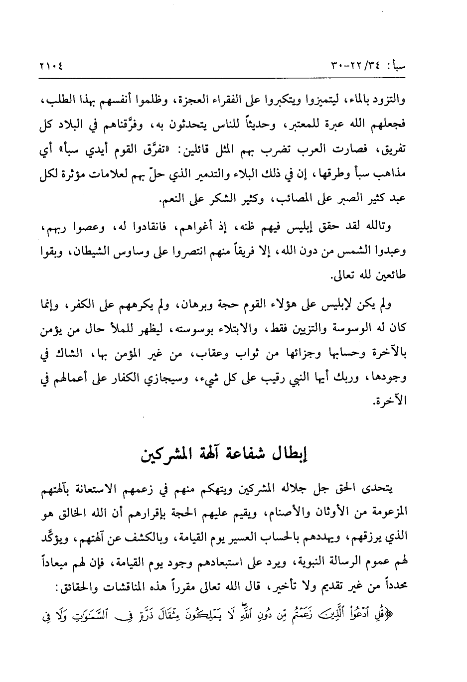 قُلِ ادْعُوا الَّذِينَ زَعَمْتُمْ مِنْ دُونِ اللَّهِ لا يَمْلِكُونَ مِثْقالَ ذَرَّةٍ فِي السَّماواتِ وَلا فِي الْأَرْضِ وَما لَهُمْ فِيهِما مِنْ شِرْكٍ وَما لَهُ مِنْهُمْ مِنْ ظَهِيرٍ (22) وَلا تَنْفَعُ الشَّفاعَةُ عِنْدَهُ إِلاَّ لِمَنْ أَذِنَ لَهُ حَتَّى إِذا فُزِّعَ عَنْ قُلُوبِهِمْ قالُوا ماذا قالَ رَبُّكُمْ قالُوا الْحَقَّ وَهُوَ الْعَلِيُّ الْكَبِيرُ (23) قُلْ مَنْ يَرْزُقُكُمْ مِنَ السَّماواتِ وَالْأَرْضِ قُلِ اللَّهُ وَإِنَّا أَوْ إِيَّاكُمْ لَعَلى هُدىً أَوْ فِي ضَلالٍ مُبِينٍ (24) قُلْ لا تُسْئَلُونَ عَمَّا أَجْرَمْنا وَلا نُسْئَلُ عَمَّا تَعْمَلُونَ (25) قُلْ يَجْمَعُ بَيْنَنا رَبُّنا ثُمَّ يَفْتَحُ بَيْنَنا بِالْحَقِّ وَهُوَ الْفَتَّاحُ الْعَلِيمُ (26)