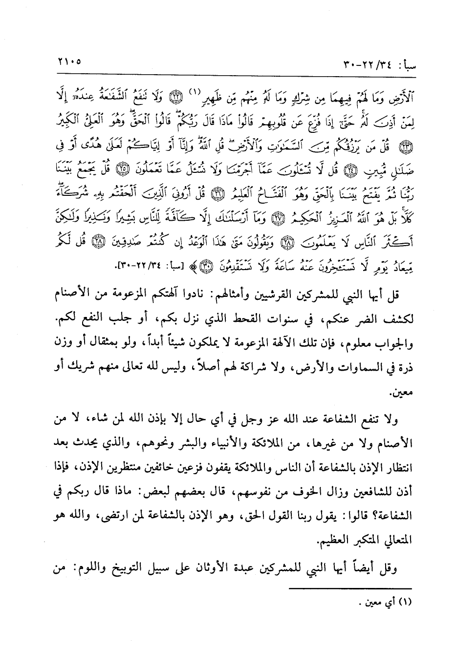 ولا تنفع الشفاعة عند الله عز وجل في أي حال إلا بإذن الله لمن شاء، لا من الأصنام ولا من غيرها، من الملائكة والأنبياء والبشر ونحوهم، والذي يحدث بعد انتظار الإذن بالشفاعة أن الناس والملائكة يقفون فزعين خائفين منتظرين الإذن، فإذا أذن للشافعين وزال الخوف من نفوسهم، قال بعضهم لبعض: ماذا قال ربكم في الشفاعة؟ قالوا: يقول ربنا القول الحق، وهو الإذن بالشفاعة لمن ارتضى، والله هو المتعالي المتكبر العظيم.