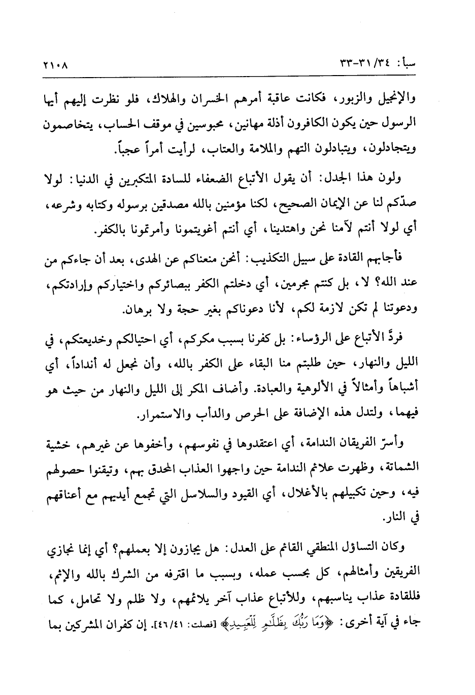وكان التساؤل المنطقي القائم على العدل: هل يجازون إلا بعملهم؟ أي إنما نجازي الفريقين وأمثالهم، كل بحسب عمله، وبسبب ما اقترفه من الشرك بالله والإثم، فللقادة عذاب يناسبهم، وللأتباع عذاب آخر يلائمهم، ولا ظلم ولا تحامل، كما جاء في آية أخرى: وَما رَبُّكَ بِظَلَّامٍ لِلْعَبِيدِ [فصلت: 41/ 46] . إن كفران المشركين بما