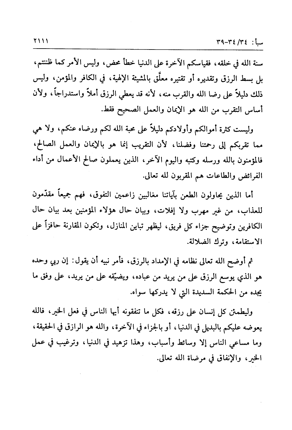 سنة الله في خلقه، فقياسكم الآخرة على الدنيا خطأ محض، وليس الأمر كما ظننتم، بل بسط الرزق وتقديره أو تقتيره معلّق بالمشيئة الإلهية، في الكافر والمؤمن، وليس ذلك دليلا على رضا الله والقرب منه، لأنه قد يعطي الرزق أملا واستدراجا، ولأن أساس التقرب من الله هو الإيمان والعمل الصحيح فقط.