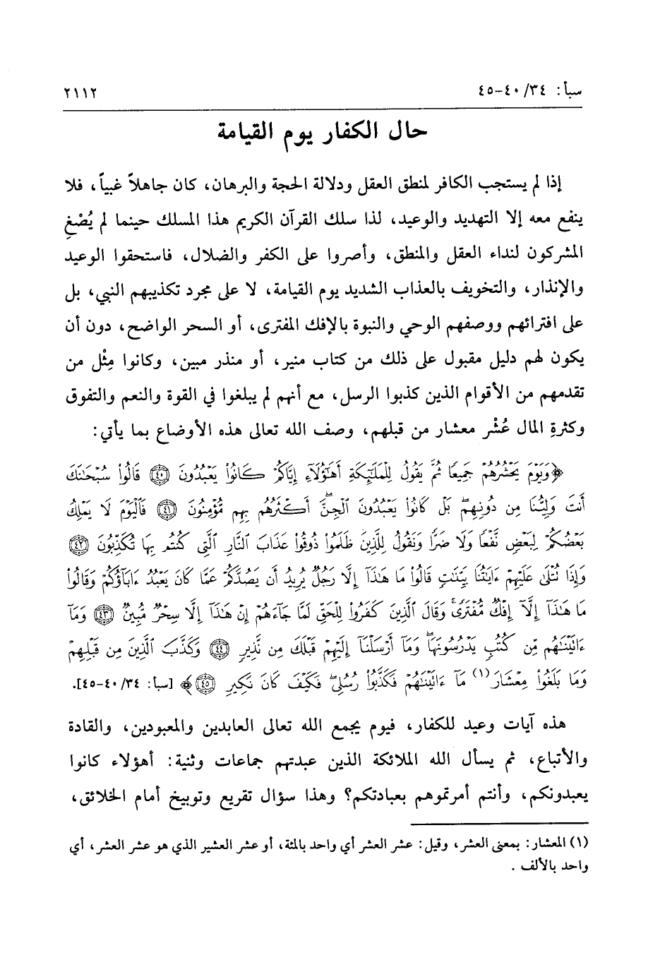 وَيَوْمَ يَحْشُرُهُمْ جَمِيعاً ثُمَّ يَقُولُ لِلْمَلائِكَةِ أَهؤُلاءِ إِيَّاكُمْ كانُوا يَعْبُدُونَ (40) قالُوا سُبْحانَكَ أَنْتَ وَلِيُّنا مِنْ دُونِهِمْ بَلْ كانُوا يَعْبُدُونَ الْجِنَّ أَكْثَرُهُمْ بِهِمْ مُؤْمِنُونَ (41) فَالْيَوْمَ لا يَمْلِكُ بَعْضُكُمْ لِبَعْضٍ نَفْعاً وَلا ضَرًّا وَنَقُولُ لِلَّذِينَ ظَلَمُوا ذُوقُوا عَذابَ النَّارِ الَّتِي كُنْتُمْ بِها تُكَذِّبُونَ (42) وَإِذا تُتْلى عَلَيْهِمْ آياتُنا بَيِّناتٍ قالُوا ما هذا إِلاَّ رَجُلٌ يُرِيدُ أَنْ يَصُدَّكُمْ عَمَّا كانَ يَعْبُدُ آباؤُكُمْ وَقالُوا ما هذا إِلاَّ إِفْكٌ مُفْتَرىً وَقالَ الَّذِينَ كَفَرُوا لِلْحَقِّ لَمَّا جاءَهُمْ إِنْ هذا إِلاَّ سِحْرٌ مُبِينٌ (43) وَما آتَيْناهُمْ مِنْ كُتُبٍ يَدْرُسُونَها وَما أَرْسَلْنا إِلَيْهِمْ قَبْلَكَ مِنْ نَذِيرٍ (44)
