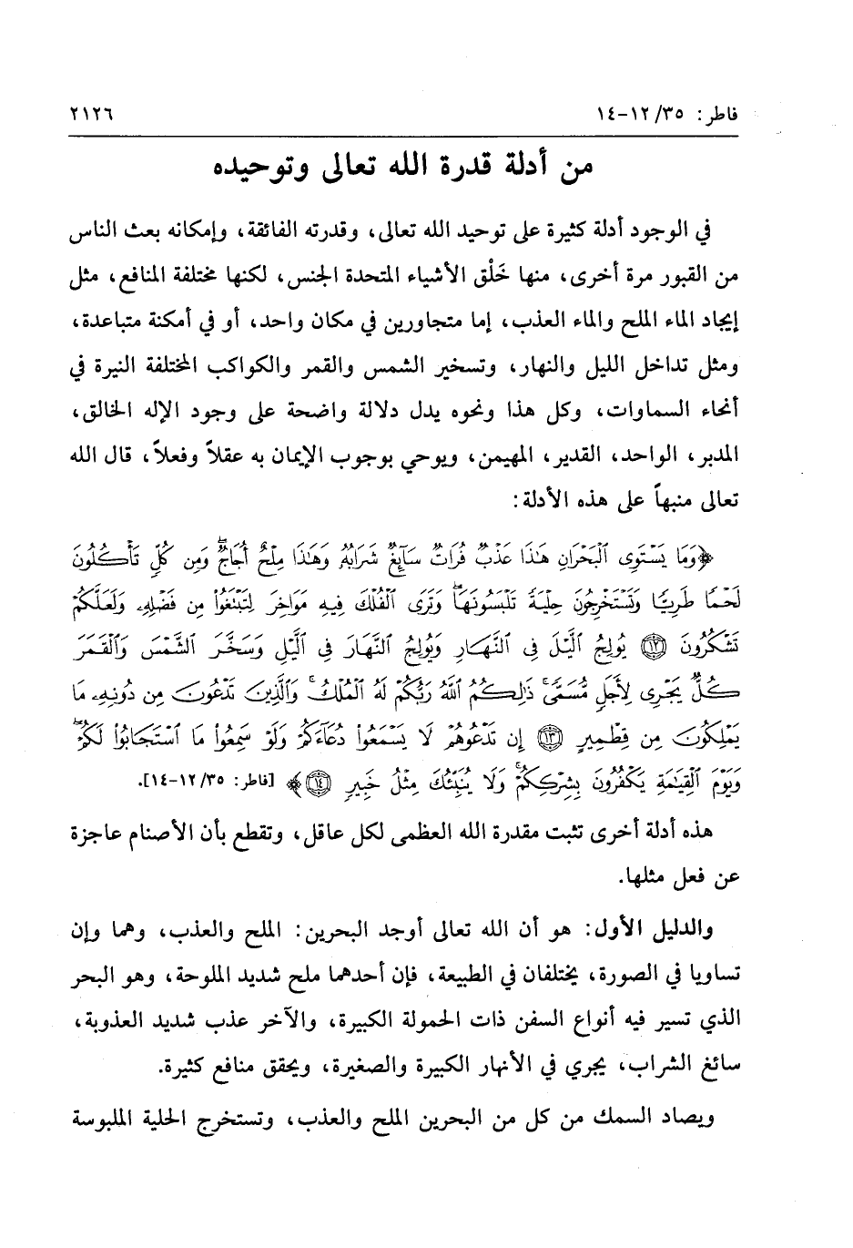 والدليل الأول: هو أن الله تعالى أوجد البحرين: الملح والعذب، وهما وإن تساويا في الصورة، يختلفان في الطبيعة، فإن أحدهما ملح شديد الملوحة، وهو البحر الذي تسير فيه أنواع السفن ذات الحمولة الكبيرة، والآخر عذب شديد العذوبة، سائغ الشراب، يجري في الأنهار الكبيرة والصغيرة، ويحقق منافع كثيرة.