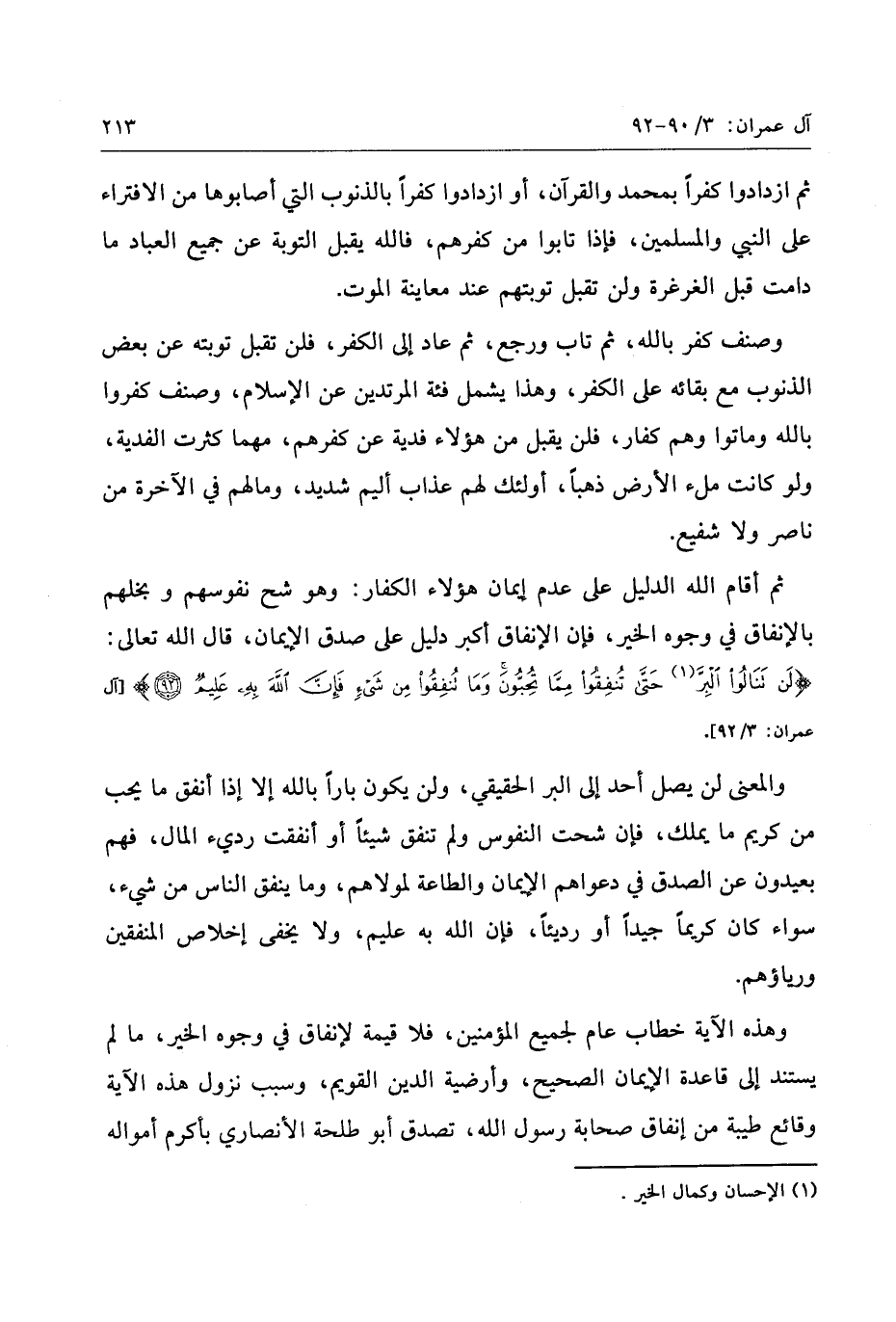 لَنْ تَنالُوا الْبِرَّ حَتَّى تُنْفِقُوا مِمَّا تُحِبُّونَ وَما تُنْفِقُوا مِنْ شَيْءٍ فَإِنَّ اللَّهَ بِهِ عَلِيمٌ (92)