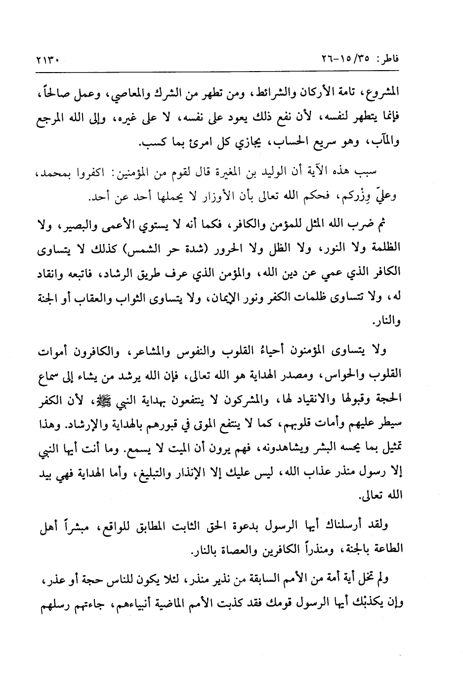 ثم ضرب الله المثل للمؤمن والكافر، فكما أنه لا يستوي الأعمى والبصير، ولا الظلمة ولا النور، ولا الظل ولا الحرور (شدة حر الشمس) كذلك لا يتساوى الكافر الذي عمي عن دين الله، والمؤمن الذي عرف طريق الرشاد، فاتبعه وانقاد له، ولا تتساوى ظلمات الكفر ونور الإيمان، ولا يتساوى الثواب والعقاب أو الجنة والنار.