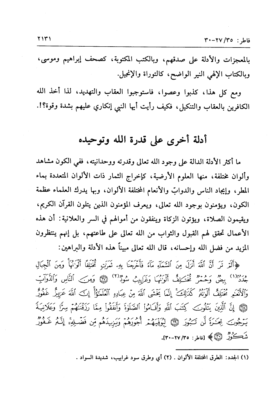 أَلَمْ تَرَ أَنَّ اللَّهَ أَنْزَلَ مِنَ السَّماءِ ماءً فَأَخْرَجْنا بِهِ ثَمَراتٍ مُخْتَلِفاً أَلْوانُها وَمِنَ الْجِبالِ جُدَدٌ بِيضٌ وَحُمْرٌ مُخْتَلِفٌ أَلْوانُها وَغَرابِيبُ سُودٌ (27) وَمِنَ النَّاسِ وَالدَّوَابِّ وَالْأَنْعامِ مُخْتَلِفٌ أَلْوانُهُ كَذلِكَ إِنَّما يَخْشَى اللَّهَ مِنْ عِبادِهِ الْعُلَماءُ إِنَّ اللَّهَ عَزِيزٌ غَفُورٌ (28) إِنَّ الَّذِينَ يَتْلُونَ كِتابَ اللَّهِ وَأَقامُوا الصَّلاةَ وَأَنْفَقُوا مِمَّا رَزَقْناهُمْ سِرًّا وَعَلانِيَةً يَرْجُونَ تِجارَةً لَنْ تَبُورَ (29) لِيُوَفِّيَهُمْ أُجُورَهُمْ وَيَزِيدَهُمْ مِنْ فَضْلِهِ إِنَّهُ غَفُورٌ شَكُورٌ (30)