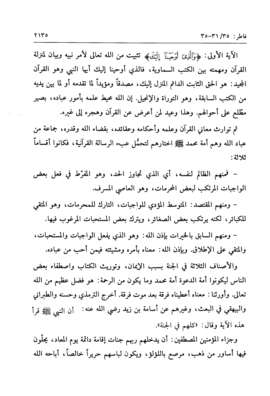ثم توارث معاني القرآن وعلمه وأحكامه وعقائده، بقضاء الله وقدره، جماعة من عباد الله وهم أمة محمد صلّى الله عليه وسلّم اختارهم لتحمّل عبء الرسالة القرآنية، فكانوا أقساما ثلاثة: