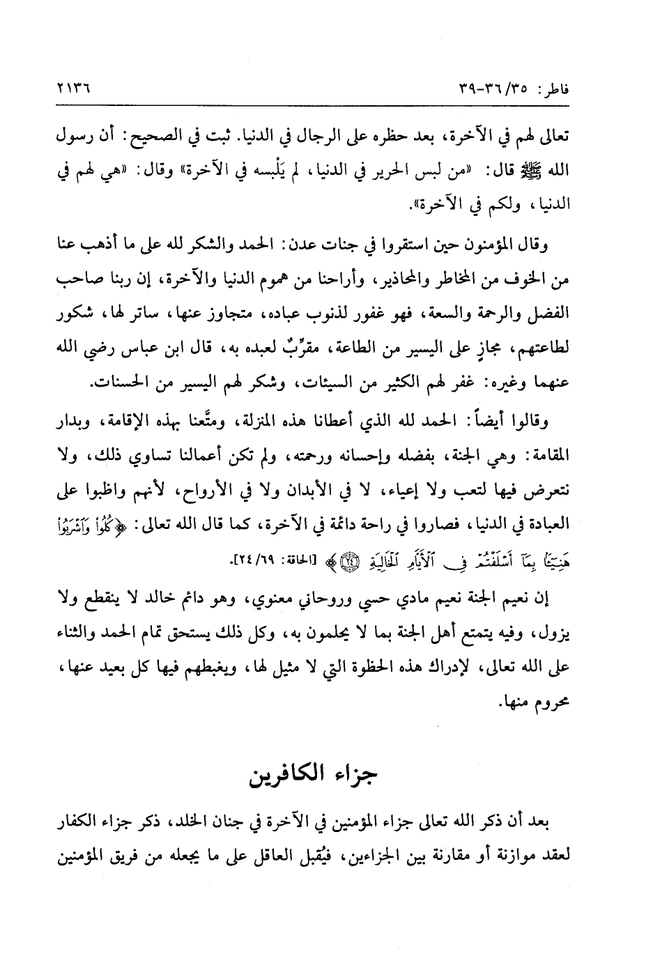 وقال المؤمنون حين استقروا في جنات عدن: الحمد والشكر لله على ما أذهب عنا من الخوف من المخاطر والمحاذير، وأراحنا من هموم الدنيا والآخرة، إن ربنا صاحب الفضل والرحمة والسعة، فهو غفور لذنوب عباده، متجاوز عنها، ساتر لها، شكور لطاعتهم، مجاز على اليسير من الطاعة، مقرّب لعبده به، قال ابن عباس رضي الله عنهما وغيره: غفر لهم الكثير من السيئات، وشكر لهم اليسير من الحسنات.