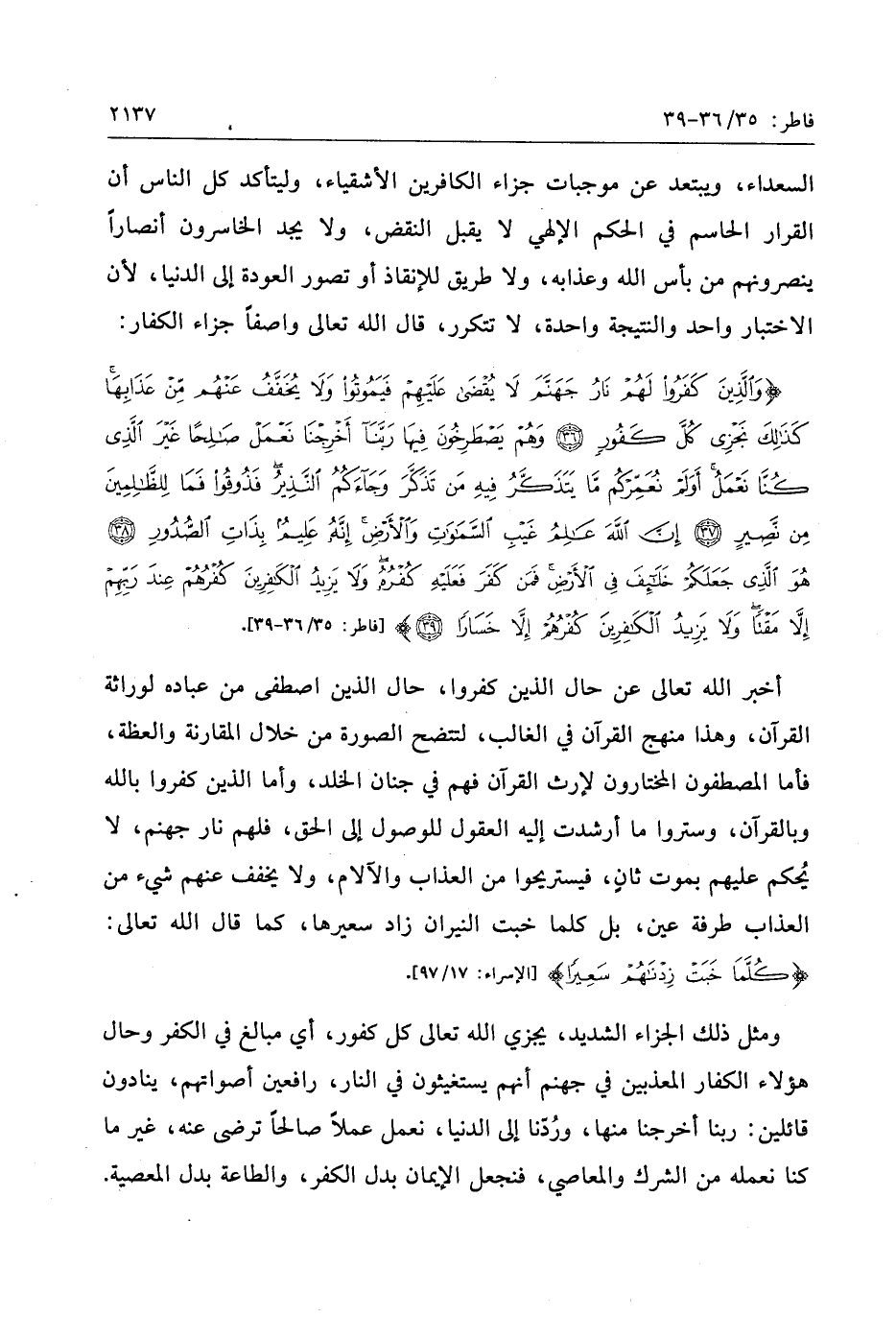 أخبر الله تعالى عن حال الذين كفروا، حال الذين اصطفى من عباده لوراثة القرآن، وهذا منهج القرآن في الغالب، لتتضح الصورة من خلال المقارنة والعظة، فأما المصطفون المختارون لإرث القرآن فهم في جنان الخلد، وأما الذين كفروا بالله وبالقرآن، وستروا ما أرشدت إليه العقول للوصول إلى الحق، فلهم نار جهنم، لا يحكم عليهم بموت ثان، فيستريحوا من العذاب والآلام، ولا يخفف عنهم شيء من العذاب طرفة عين، بل كلما خبت النيران زاد سعيرها، كما قال الله تعالى: