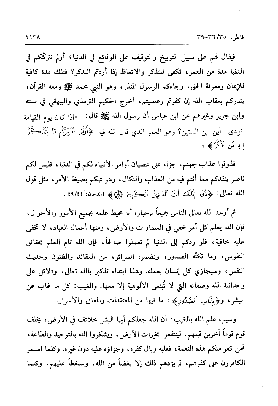 وسبب علم الله بالغيب: أن الله جعلكم أيها البشر خلائف في الأرض، يخلف قوم قوما آخرين قبلهم، لينتفعوا بخيرات الأرض، ويشكروا الله بالتوحيد والطاعة، فمن كفر منكم هذه النعمة، فعليه وبال كفره، وجزاؤه عليه دون غيره. وكلما استمر الكافرون على كفرهم، لم يزدهم ذلك إلا بغضا من الله، وسخطا عليهم، وكلما