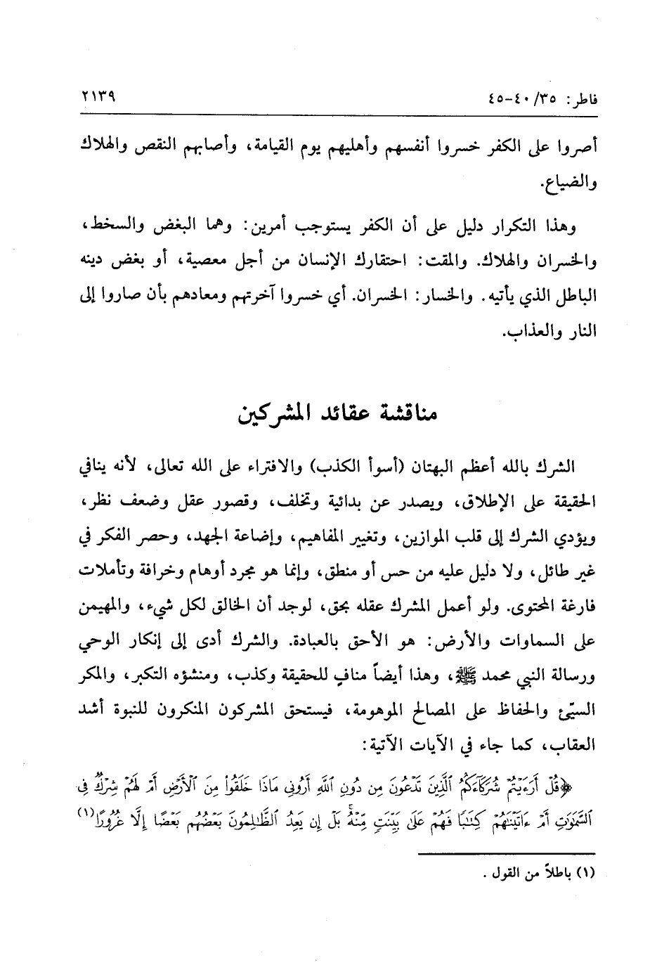 قُلْ أَرَأَيْتُمْ شُرَكاءَكُمُ الَّذِينَ تَدْعُونَ مِنْ دُونِ اللَّهِ أَرُونِي ماذا خَلَقُوا مِنَ الْأَرْضِ أَمْ لَهُمْ شِرْكٌ فِي السَّماواتِ أَمْ آتَيْناهُمْ كِتاباً فَهُمْ عَلى بَيِّنَةٍ مِنْهُ بَلْ إِنْ يَعِدُ الظَّالِمُونَ بَعْضُهُمْ بَعْضاً إِلاَّ غُرُوراً «1» (40) إِنَّ اللَّهَ يُمْسِكُ السَّماواتِ وَالْأَرْضَ أَنْ تَزُولا وَلَئِنْ زالَتا إِنْ أَمْسَكَهُما مِنْ أَحَدٍ مِنْ بَعْدِهِ إِنَّهُ كانَ حَلِيماً غَفُوراً (41) وَأَقْسَمُوا بِاللَّهِ جَهْدَ أَيْمانِهِمْ لَئِنْ جاءَهُمْ نَذِيرٌ لَيَكُونُنَّ أَهْدى مِنْ إِحْدَى الْأُمَمِ فَلَمَّا جاءَهُمْ نَذِيرٌ ما زادَهُمْ إِلاَّ نُفُوراً (42) اسْتِكْباراً فِي الْأَرْضِ وَمَكْرَ السَّيِّئِ وَلا يَحِيقُ الْمَكْرُ السَّيِّئُ إِلاَّ بِأَهْلِهِ فَهَلْ يَنْظُرُونَ إِلاَّ سُنَّتَ الْأَوَّلِينَ فَلَنْ تَجِدَ لِسُنَّتِ اللَّهِ تَبْدِيلاً وَلَنْ تَجِدَ لِسُنَّتِ اللَّهِ تَحْوِيلاً (43) أَوَلَمْ يَسِيرُوا فِي الْأَرْضِ فَيَنْظُرُوا كَيْفَ كانَ عاقِبَةُ الَّذِينَ مِنْ قَبْلِهِمْ وَكانُوا أَشَدَّ مِنْهُمْ قُوَّةً وَما كانَ اللَّهُ لِيُعْجِزَهُ مِنْ شَيْءٍ فِي السَّماواتِ وَلا فِي الْأَرْضِ إِنَّهُ كانَ عَلِيماً قَدِيراً (44)