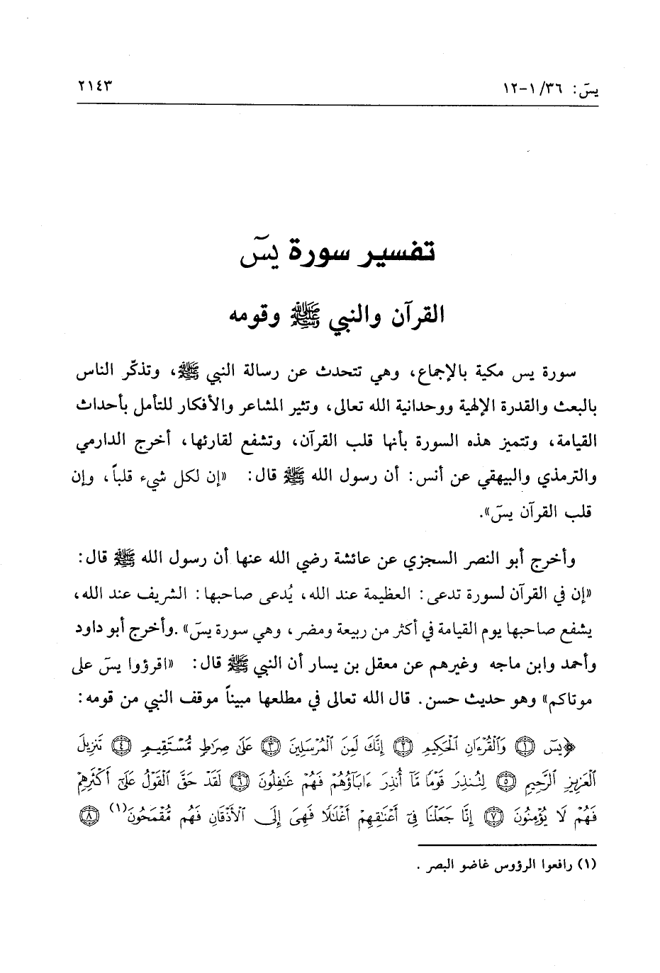 أخرج الدارمي والترمذي والبيهقي عن أنس: أن رسول الله صلّى الله عليه وسلّم قال: «إن لكل شيء قلبا، وإن قلب القرآن يس» .