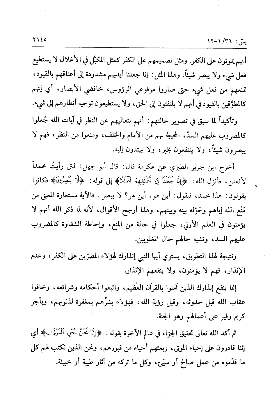 أنهم يموتون على الكفر. ومثل تصميمهم على الكفر كمثل المكبّل في الأغلال لا يستطيع فعل شيء ولا يبصر شيئا. وهذا المثل: إنا جعلنا أيديهم مشدودة إلى أعناقهم بالقيود، تمنعهم من فعل شيء حتى صاروا مرفوعي الرؤوس، خافضي الأبصار، أي إنهم كالمطوّقين بالقيود في أنهم لا يلتفتون إلى الحق، ولا يستطيعون توجيه أنظارهم إلى شيء.