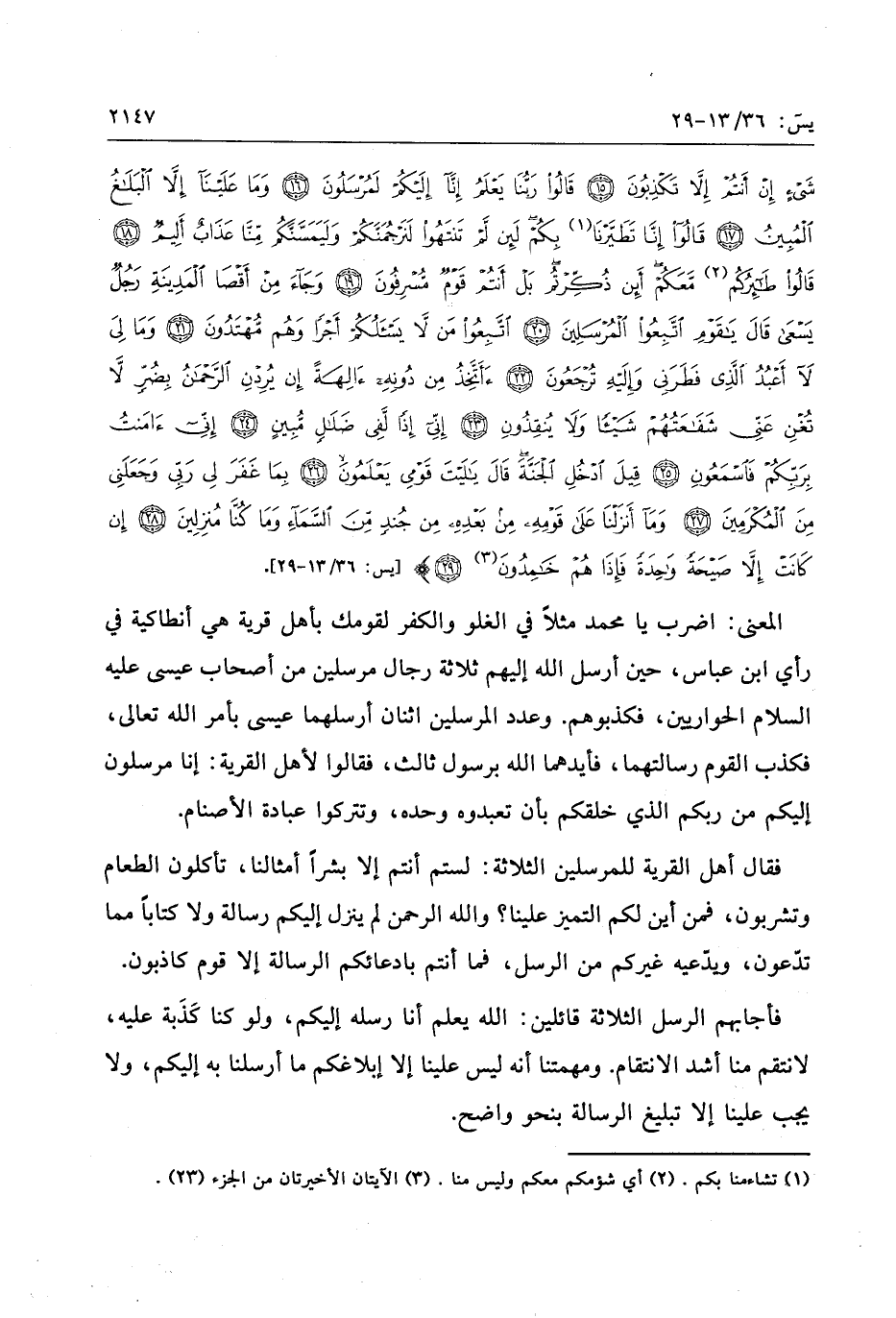 المعنى: اضرب يا محمد مثلا في الغلو والكفر لقومك بأهل قرية هي أنطاكية في رأي ابن عباس، حين أرسل الله إليهم ثلاثة رجال مرسلين من أصحاب عيسى عليه السّلام الحواريين، فكذبوهم. وعدد المرسلين اثنان أرسلهما عيسى بأمر الله تعالى، فكذب القوم رسالتهما، فأيدهما الله برسول ثالث، فقالوا لأهل القرية: إنا مرسلون إليكم من ربكم الذي خلقكم بأن تعبدوه وحده، وتتركوا عبادة الأصنام.