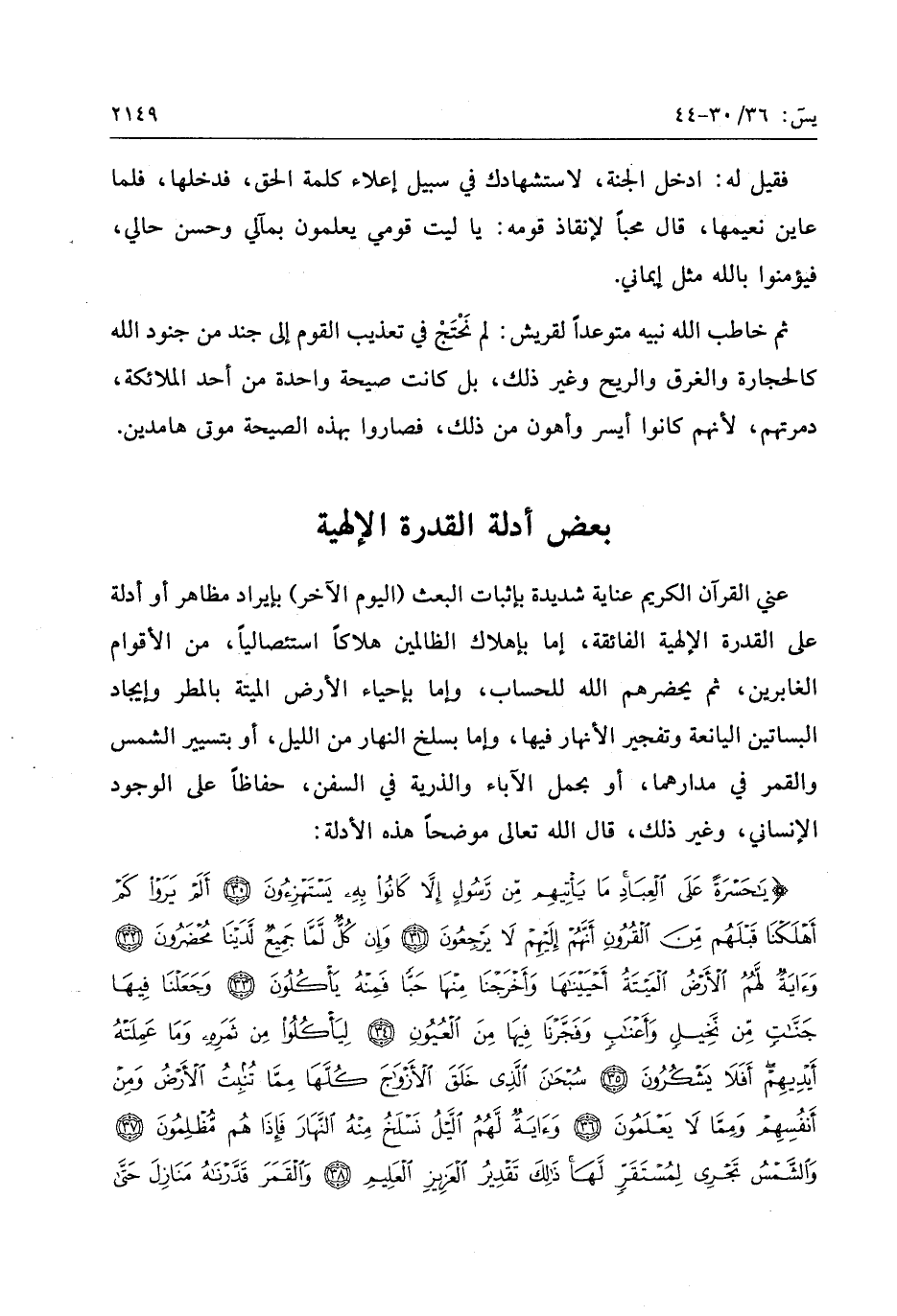 يا حَسْرَةً عَلَى الْعِبادِ ما يَأْتِيهِمْ مِنْ رَسُولٍ إِلاَّ كانُوا بِهِ يَسْتَهْزِؤُنَ (30) أَلَمْ يَرَوْا كَمْ أَهْلَكْنا قَبْلَهُمْ مِنَ الْقُرُونِ أَنَّهُمْ إِلَيْهِمْ لا يَرْجِعُونَ (31) وَإِنْ كُلٌّ لَمَّا جَمِيعٌ لَدَيْنا مُحْضَرُونَ (32) وَآيَةٌ لَهُمُ الْأَرْضُ الْمَيْتَةُ أَحْيَيْناها وَأَخْرَجْنا مِنْها حَبًّا فَمِنْهُ يَأْكُلُونَ (33) وَجَعَلْنا فِيها جَنَّاتٍ مِنْ نَخِيلٍ وَأَعْنابٍ وَفَجَّرْنا فِيها مِنَ الْعُيُونِ (34)
