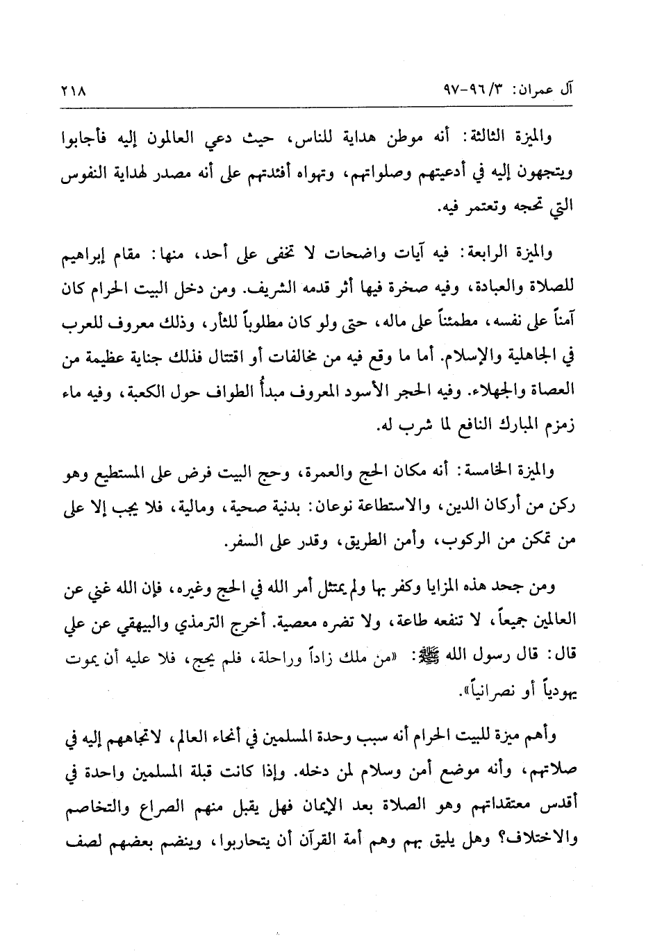 والميزة الرابعة: فيه آيات واضحات لا تخفى على أحد، منها: مقام إبراهيم للصلاة والعبادة، وفيه صخرة فيها أثر قدمه الشريف. ومن دخل البيت الحرام كان آمنا على نفسه، مطمئنا على ماله، حتى ولو كان مطلوبا للثأر، وذلك معروف للعرب في الجاهلية والإسلام. أما ما وقع فيه من مخالفات أو اقتتال فذلك جناية عظيمة من العصاة والجهلاء. وفيه الحجر الأسود المعروف مبدأ الطواف حول الكعبة، وفيه ماء زمزم المبارك النافع لما شرب له.