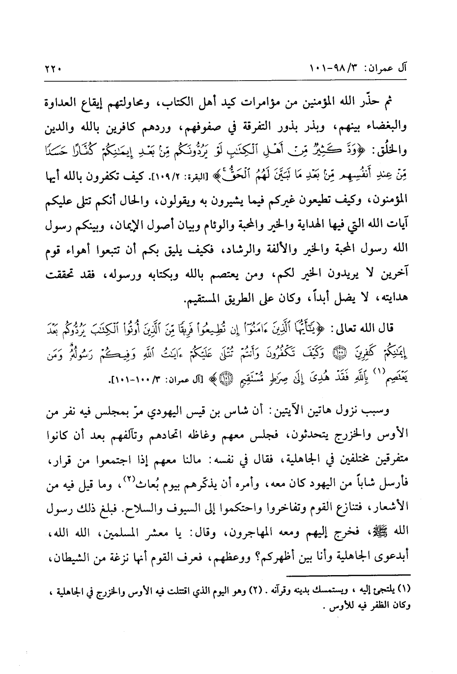 أن شاس بن قيس اليهودي مرّ بمجلس فيه نفر من الأوس والخزرج يتحدثون، فجلس معهم وغاظه اتحادهم وتآلفهم بعد أن كانوا متفرقين مختلفين في الجاهلية، فقال في نفسه: مالنا معهم إذا اجتمعوا من قرار، فأرسل شابا من اليهود كان معه، وأمره أن يذكّرهم بيوم بعاث «2» ، وما قيل فيه من الأشعار، فتنازع القوم وتفاخروا واحتكموا إلى السيوف والسلاح. فبلغ ذلك رسول الله صلّى الله عليه وسلّم، فخرج إليهم ومعه المهاجرون، وقال: يا معشر المسلمين، الله الله، أبدعوى الجاهلية وأنا بين أظهركم؟ ووعظهم، فعرف القوم أنها نزغة من الشيطان،
