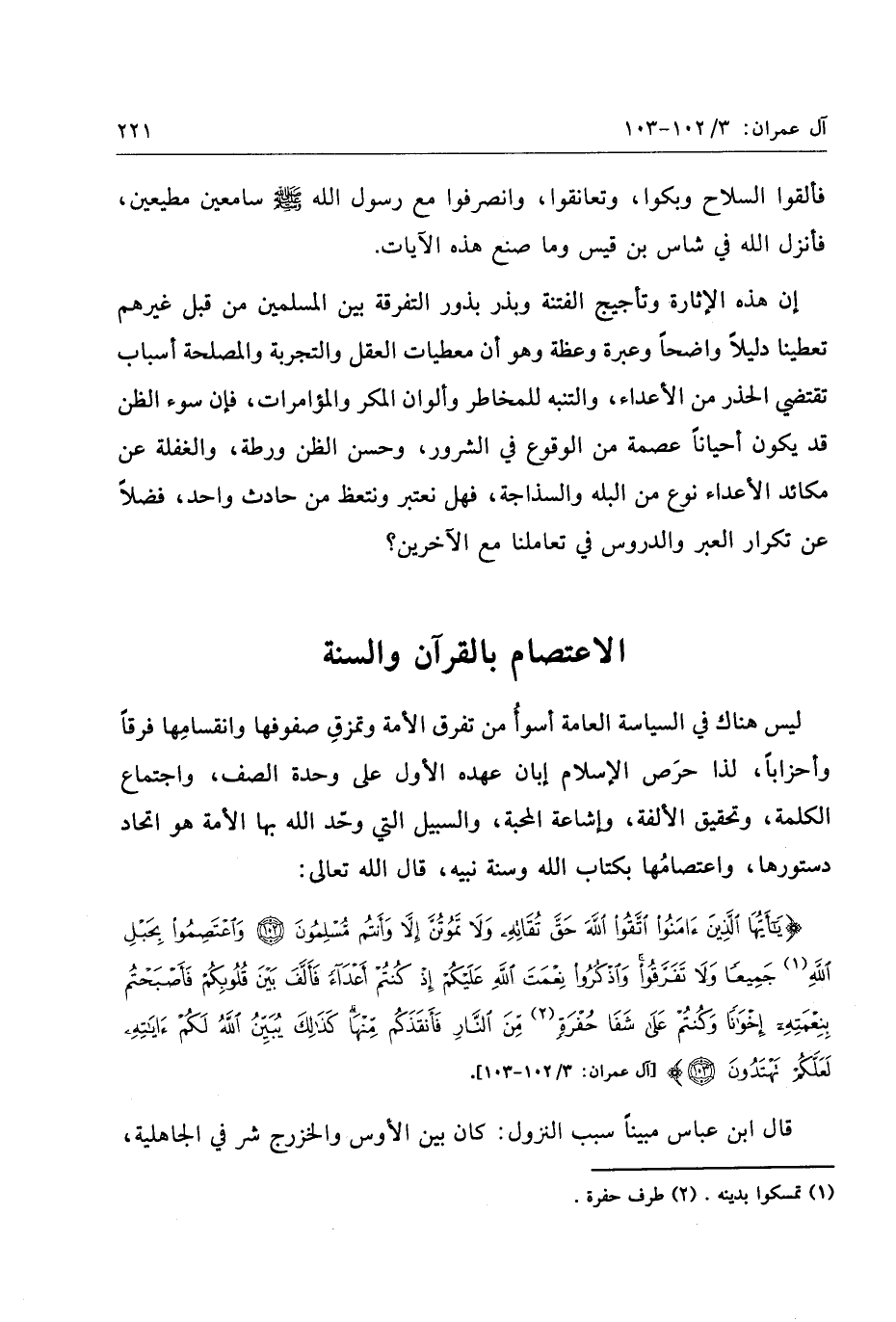 يا أَيُّهَا الَّذِينَ آمَنُوا اتَّقُوا اللَّهَ حَقَّ تُقاتِهِ وَلا تَمُوتُنَّ إِلاَّ وَأَنْتُمْ مُسْلِمُونَ (102) وَاعْتَصِمُوا بِحَبْلِ اللَّهِ جَمِيعاً وَلا تَفَرَّقُوا وَاذْكُرُوا نِعْمَتَ اللَّهِ عَلَيْكُمْ إِذْ كُنْتُمْ أَعْداءً فَأَلَّفَ بَيْنَ قُلُوبِكُمْ فَأَصْبَحْتُمْ بِنِعْمَتِهِ إِخْواناً وَكُنْتُمْ عَلى شَفا حُفْرَةٍ مِنَ النَّارِ فَأَنْقَذَكُمْ مِنْها كَذلِكَ يُبَيِّنُ اللَّهُ لَكُمْ آياتِهِ لَعَلَّكُمْ تَهْتَدُونَ (103)