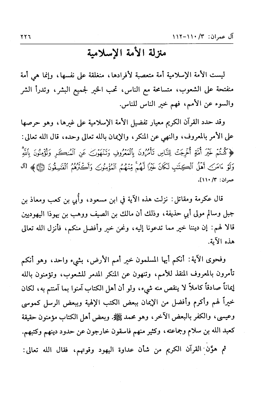 كُنْتُمْ خَيْرَ أُمَّةٍ أُخْرِجَتْ لِلنَّاسِ تَأْمُرُونَ بِالْمَعْرُوفِ وَتَنْهَوْنَ عَنِ الْمُنْكَرِ وَتُؤْمِنُونَ بِاللَّهِ وَلَوْ آمَنَ أَهْلُ الْكِتابِ لَكانَ خَيْراً لَهُمْ مِنْهُمُ الْمُؤْمِنُونَ وَأَكْثَرُهُمُ الْفاسِقُونَ (110)
