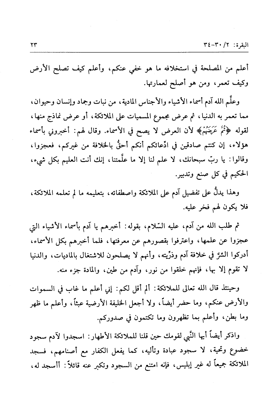 ثم طلب الله من آدم، عليه السّلام، بقوله: أخبرهم يا آدم بأسماء الأشياء التي عجزوا عن علمها، واعترفوا بقصورهم عن معرفتها، فلما أخبرهم بكل الأسماء، أدركوا السّرّ في خلافة آدم وذرّيته، وأنهم لا يصلحون للاشتغال بالماديات، والدنيا لا تقوم إلا بها، فإنهم خلقوا من نور، وآدم من طين، والمادة جزء منه.